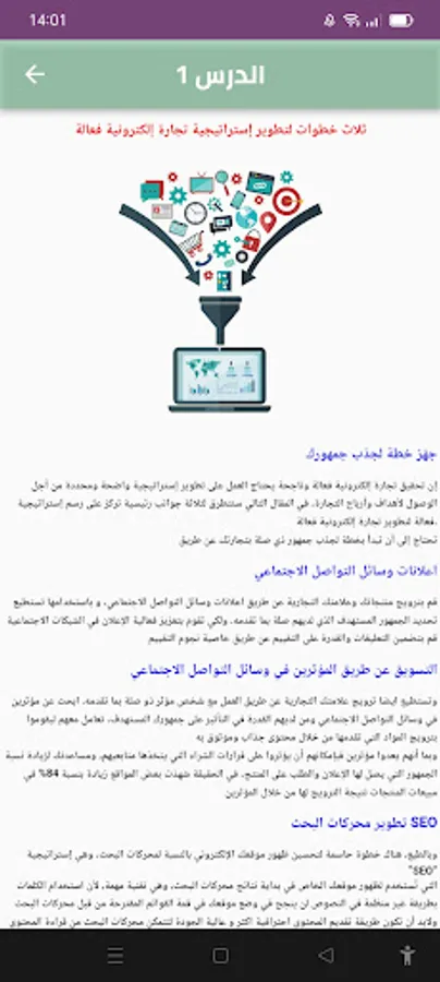 مجاني يأخذ بيدك خطوة خطوة نحو تعلم التجارة الالكترونية من الصفر كما ستتعرف في هذا التطبيق على معارف كثيرة في مجال التجارة الالكترونية منها :