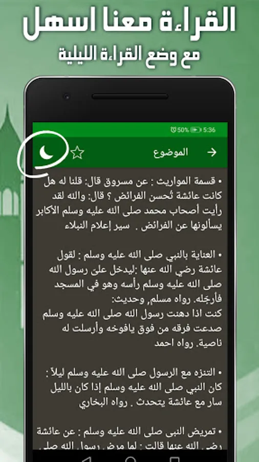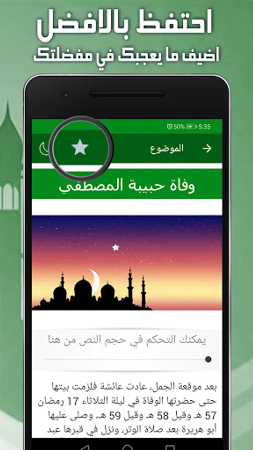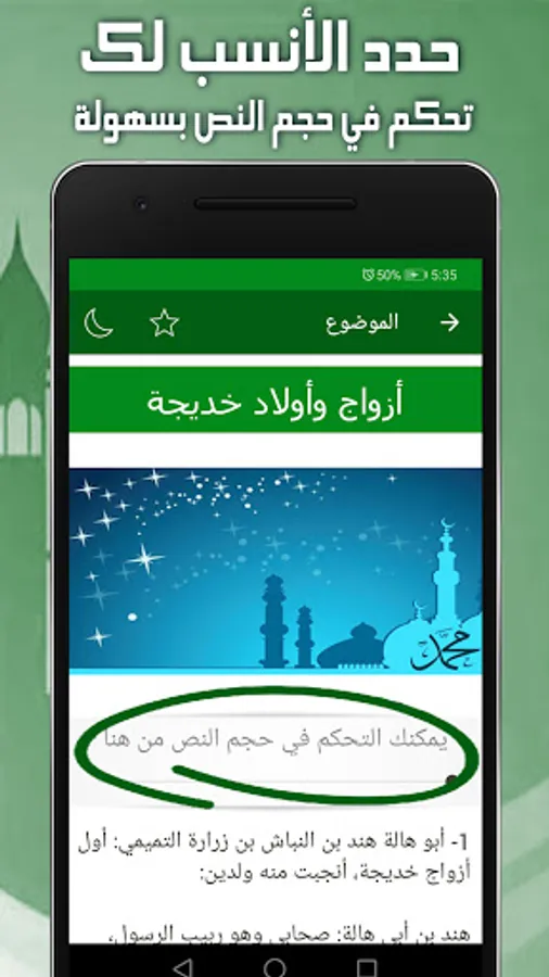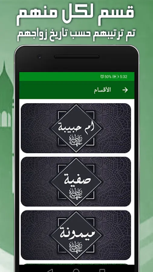Within the application, you will find a section for each one of the wives of the Prophet Muhammad and the mothers of the believers, all of this in order for the wives in terms of the date of their marriage with the Prophet Muhammad, may God bless him and grant him peace, beginning with Mrs. Sawda bint Zama’a, who raised his children, and then the only eldest whom the Prophet married, namely, Aisha Habiba al-Mustafa and his most close wives to his heart, and Mrs. Hafsa bint Omar, may God be pleased with her, and the daughter of the great companion Omar Ibn Al-Khattab, as well as Mrs. Mother of the Believers Zainab bint Khuzaymah and Mrs. Hind bint Abi Umayyah. She was nicknamed Umm Salama, the mother of the believers, Zainab bint Jahsh, Mrs. Juwayriyah bint Al-Harith, may God be pleased with her, and Mrs. Ramla bint Abi Sufyan, nicknamed Umm Habiba, Safiya bint Hayy, and his last auspicious wife, bint Al-Harith, may God be pleased with her. The wives of the Messenger, but they are not from the mothers of the believers.. The information presented is divided into separate topics such as: