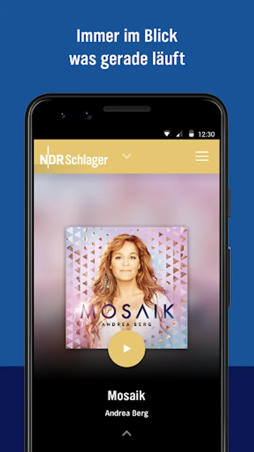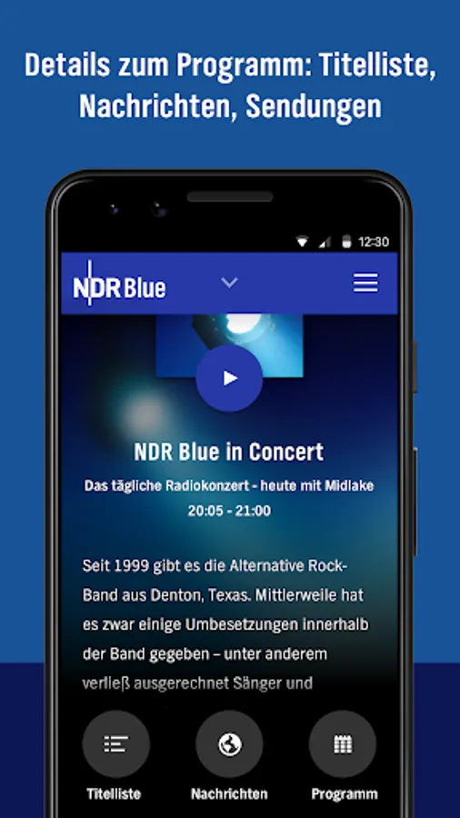 - Title displays and program information: In the dynamic player display of the NDR Radio App, the moderators, studio guests and the CD cover with title information are always displayed in line with the program.
