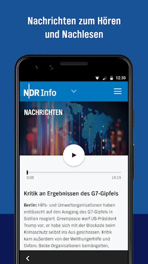 - News: One click on the "News" button and the current news edition will be played. Always know what is happening in the world via the "news" in the menu. Here you can read and listen to the NDR Info News.