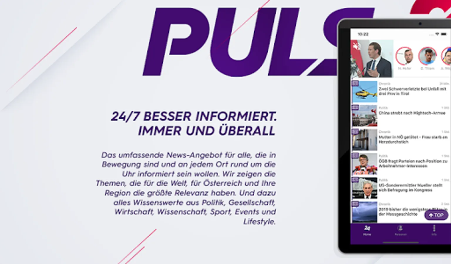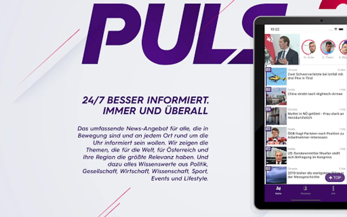 Always receive all the latest news on the top topics that affect Austria and the world. The PULS 24 app offers you comprehensive and reliable reporting including the fastest push notifications on breaking news.