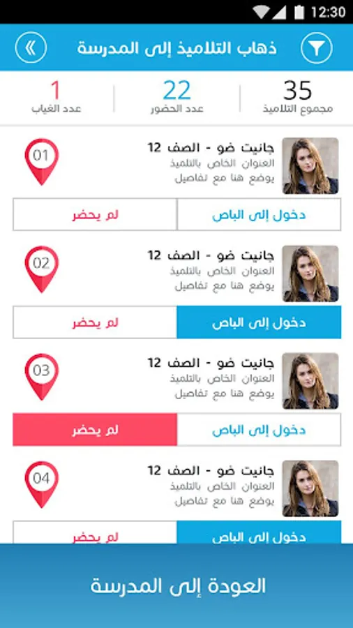 This app works coordinately with EduFlag Parents, it allows parents to track their kid's routes and distances while they are on the school bus. The driver takes attendance using EduFlag driver, he picks students from their homes and drops them at school using the app to notify parents.