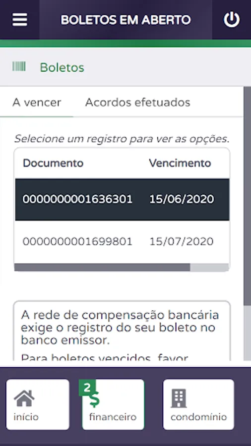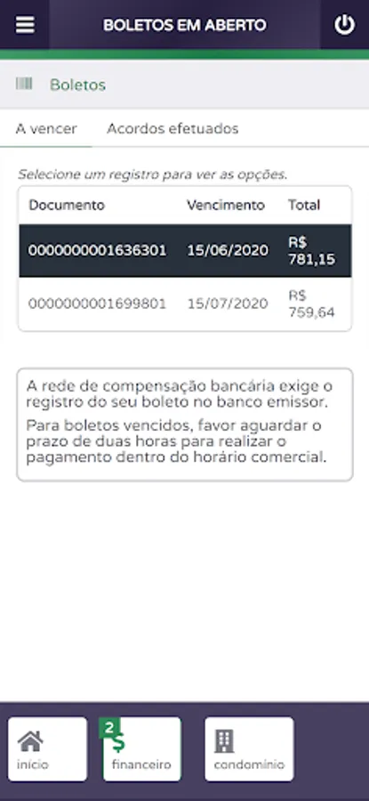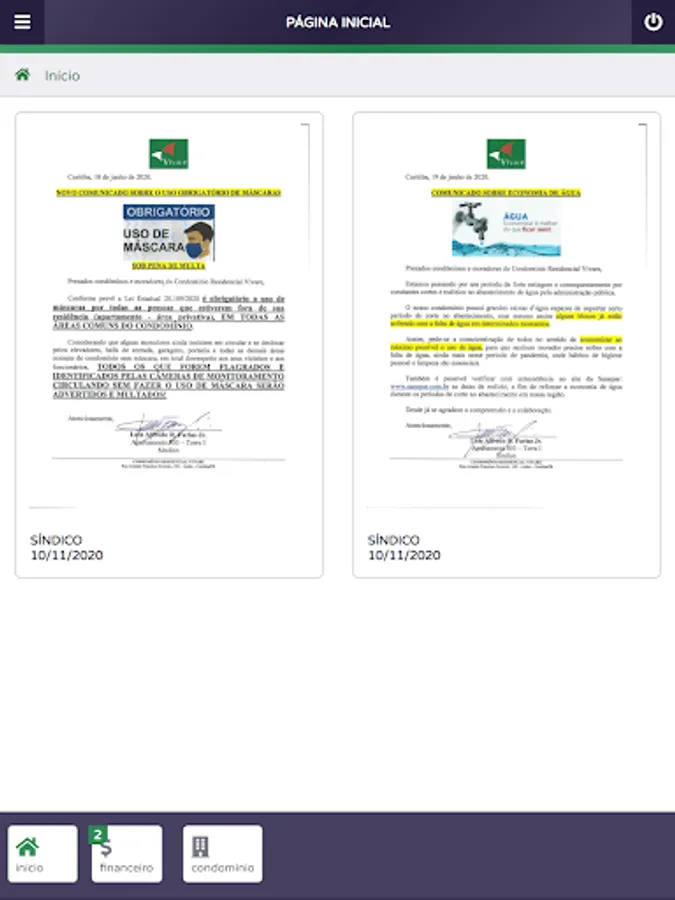 With the application, you have the various functionalities available, whether for the owner to manage himself in the settlement of the pending fee, receipt of the original slip or printing of the 2nd. via, consult the history of settled invoices, check pending items, read or print reports when made available by your condominium.