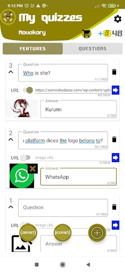 Regarding questions, you can add a question, an answer, and an image, either by URL or locally.
