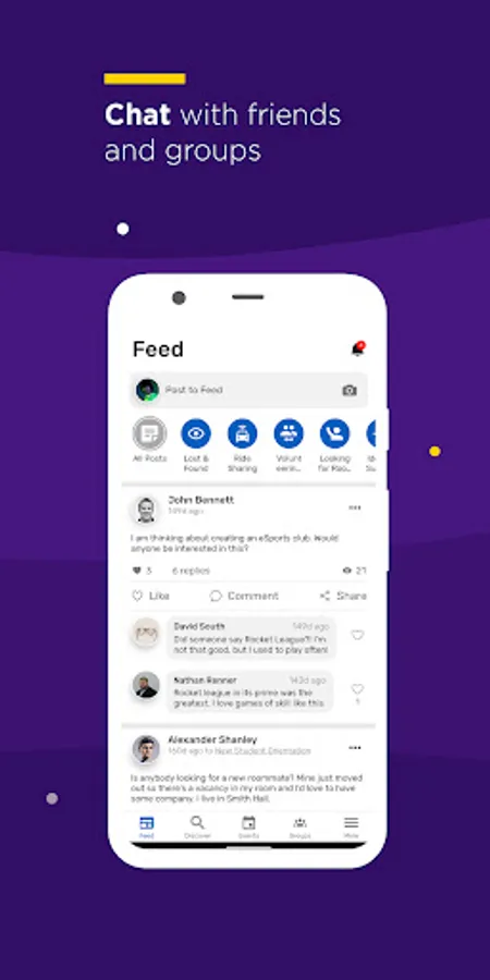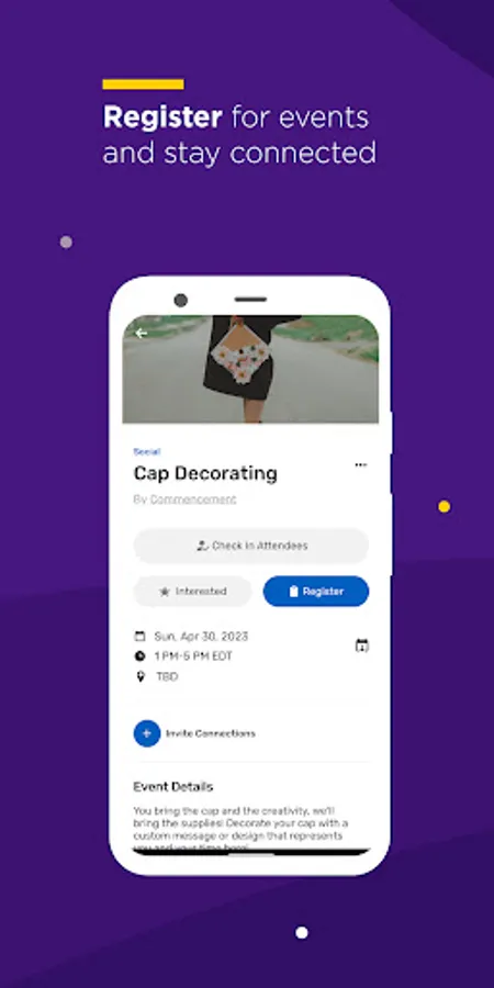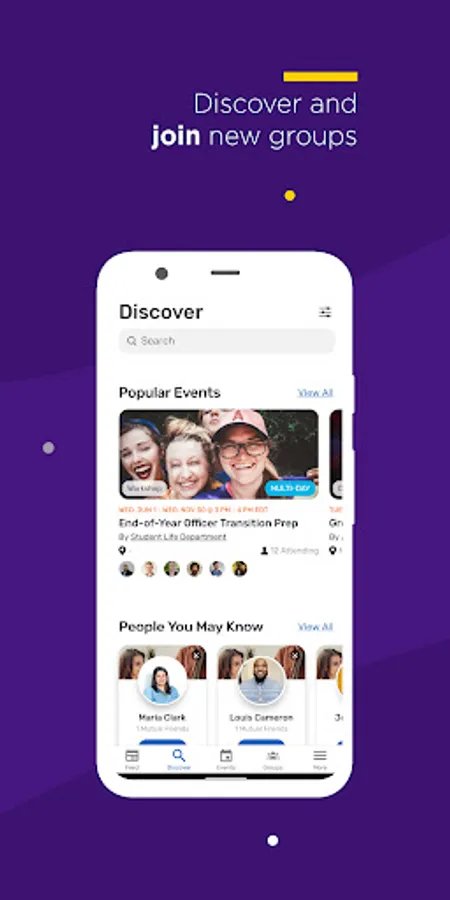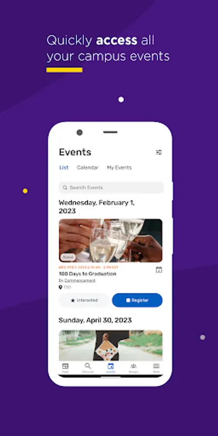 Easily browse and RSVP for upcoming events, join organizations, and share news with your network. Also, find and access resources on campus. Key features include: