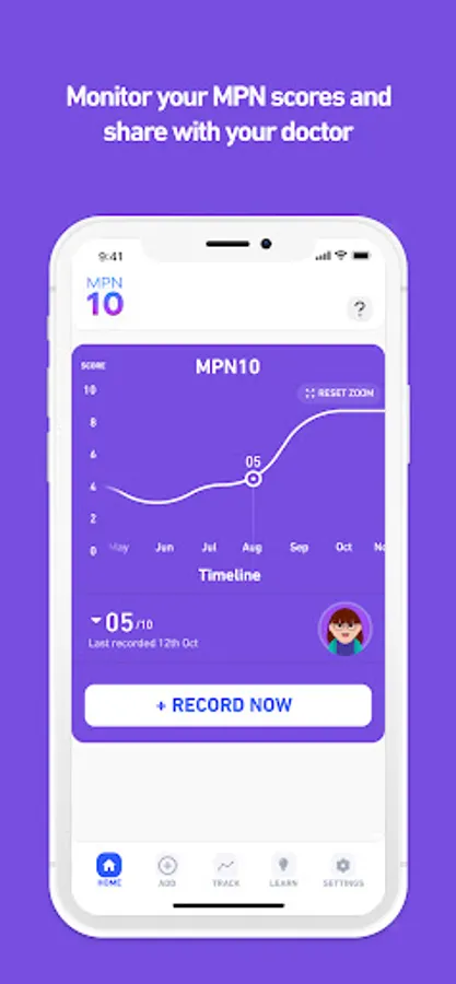 Once symptom records have been logged, you can see the history of each of your symptoms across a time period of your choosing. As well as tracking each individual symptom’s progress, the app shows an average of your symptoms to show an overall trend. Reminders will also be on the app to help remember to take the questionnaire and monitor your MPN.