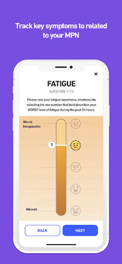 The app has been designed to allow for intuitive and quick input of the various symptoms of myeloproliferative neoplasm. Each day you can record the severity of ten symptoms on a scale of one to ten, with ten being the most severe.
