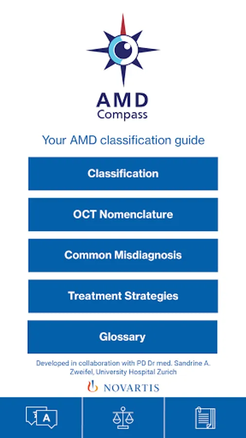 AMD Compass App provides the new classification for Age-related Macular Degeneration (AMD) with representative illustrations and images. The AMD Compass App has been developed by Novartis intends to support Ophthalmologists in their routine clinical practice as an educational tool and lexicon.
