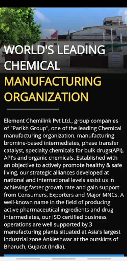 Element Chemilink Pvt Ltd., group companies of ''Parikh Group'', one of the leading Chemical manufacturing organization, manufacturing bromine-based intermediates, phase transfer catalyst, specialty chemicals for bulk drugs (API), API's and organic chemicals.