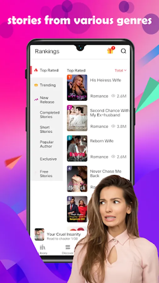 We cover categories of Marriage, CEO, Young Adult and other kinds of Romance fictions, in addition to Werewolf, LGBTQ+ and else. Here you can be immersed in thousands of quality stories by a new breed of writers, or choose to update your own stories.