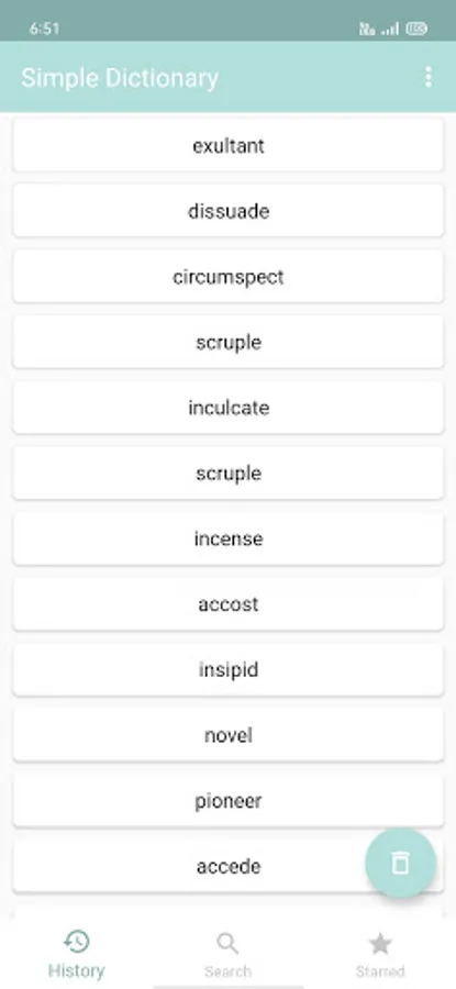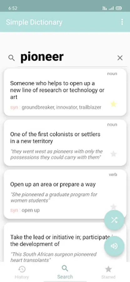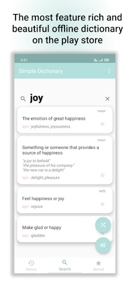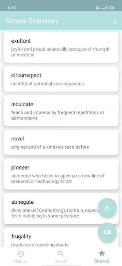 Other features include a Read aloud button to read aloud the word when pressed and also the meanings when long pressed, Option to export the starred words as a .csv file, an inbuilt flash cards feature where flash cards are generated automatically from your starred words and many more !