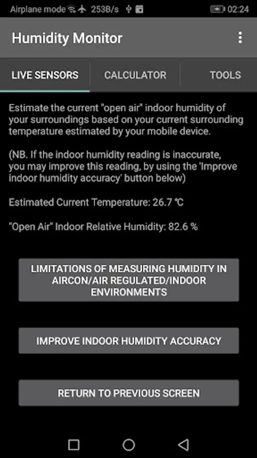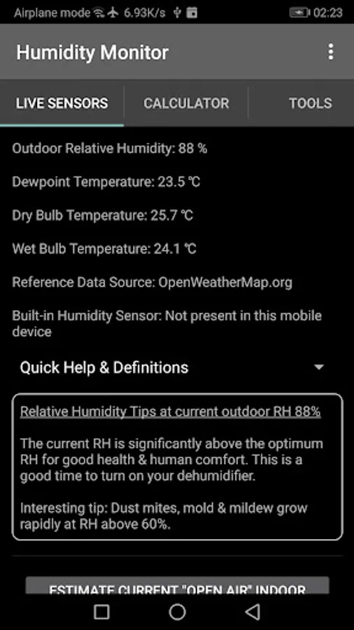 * MORE ACCURATE READINGS: If your mobile device is equipped with a built-in humidity sensor like the Samsung Galaxy S4, you can get highly accurate outdoor & indoor humidity readings of your surroundings. If your device has no humidity sensor, this app will also be able to estimate your current "open air" indoor humidity & allow users to provide custom info to improve the accuracy if the estimate is inaccurate