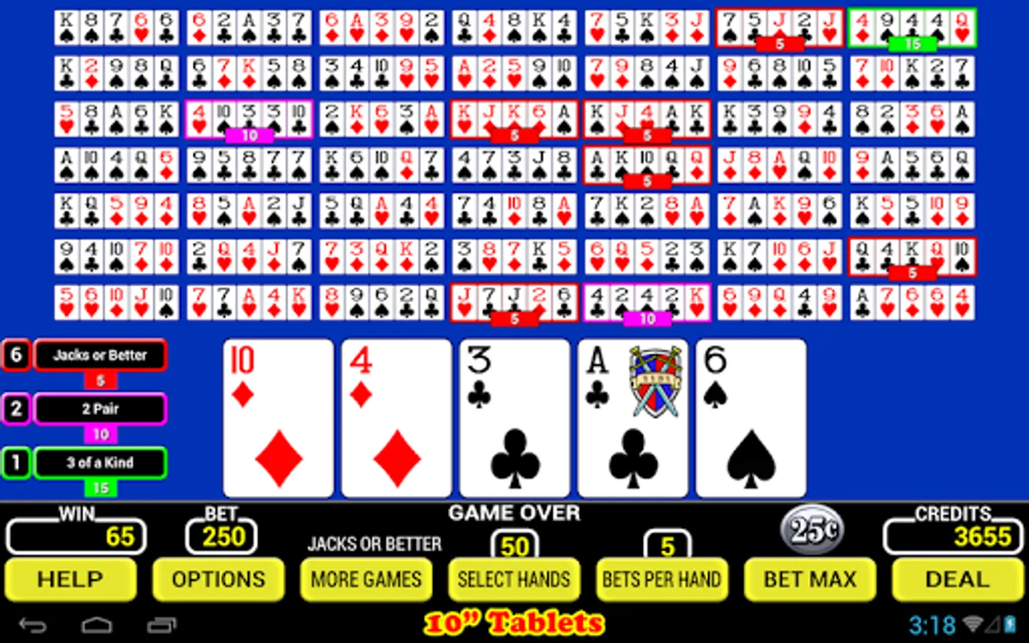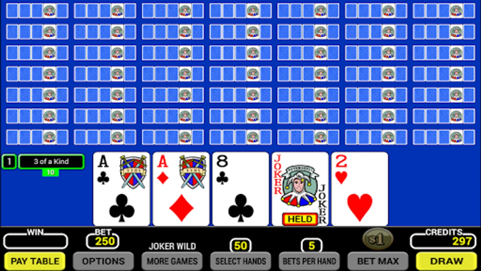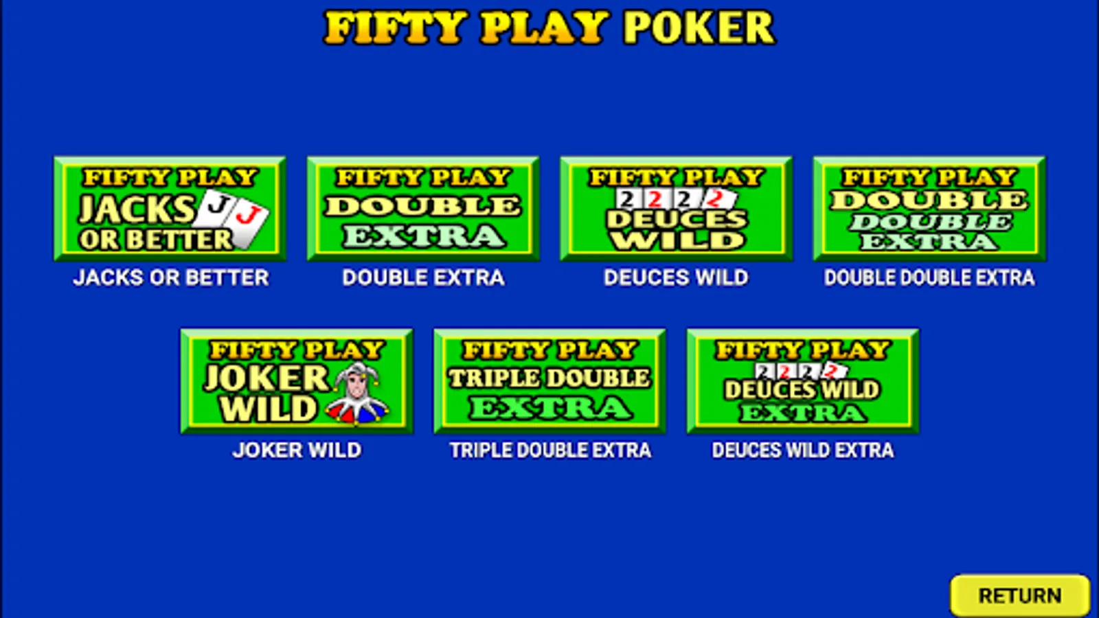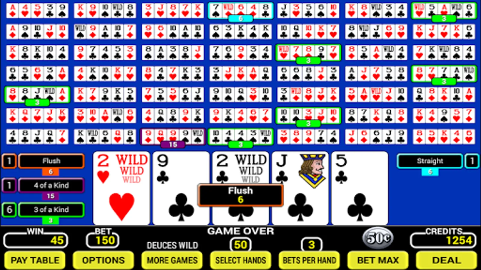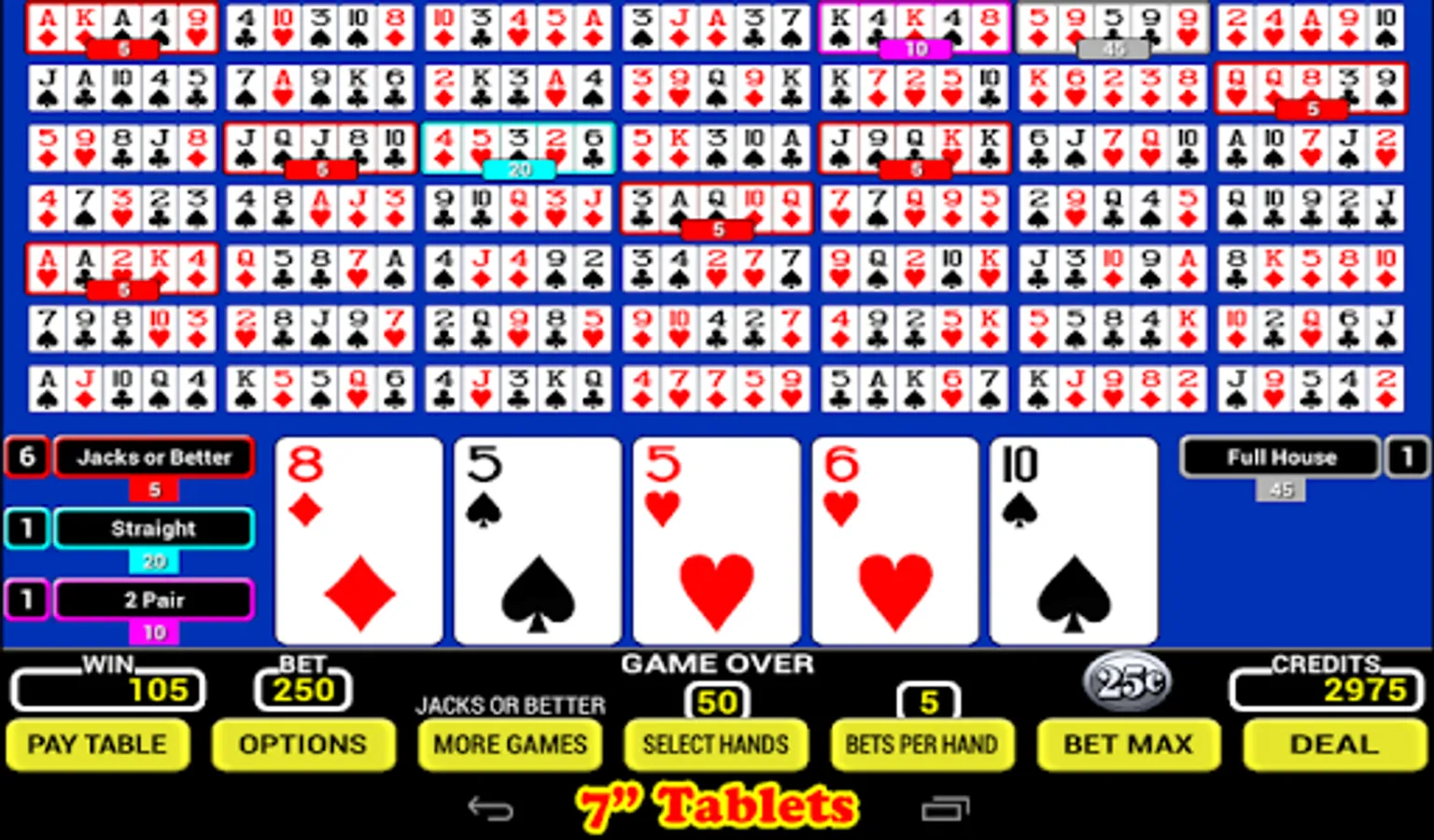 Fifty hand multi-play video poker. 50 hands at once for 50 times the action! Unlike slots machines, video poker allows the player to use skill to beat the house. Play this popular game just like in Vegas.