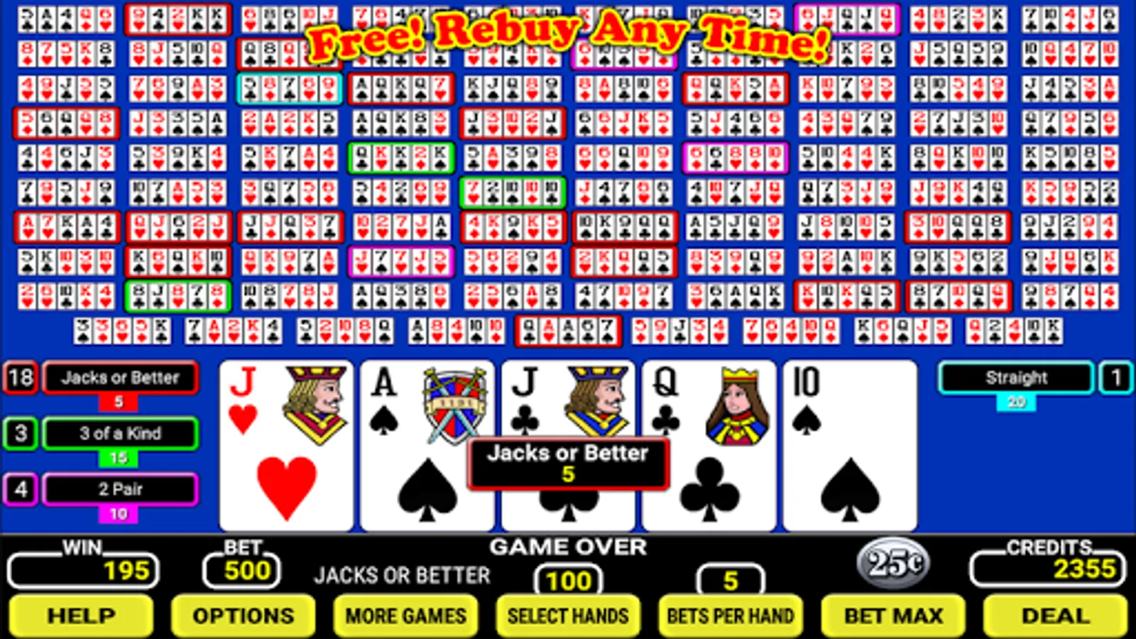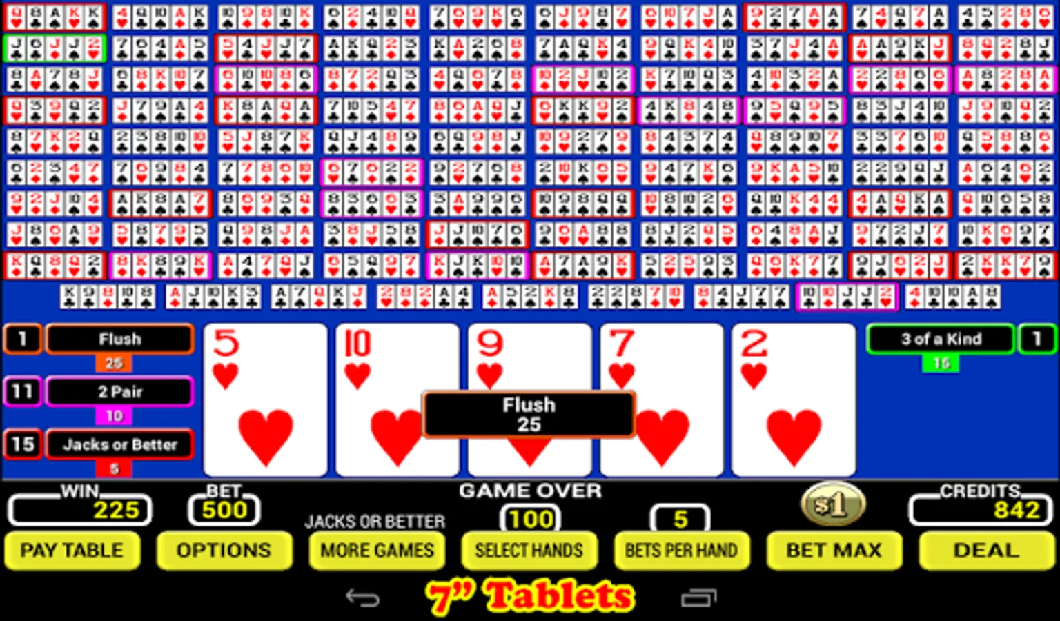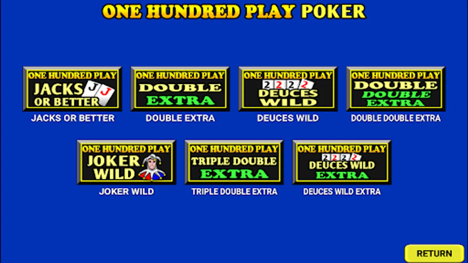 One Hundred hand multi-play video poker. 100 hands at once for 100 times the action! Unlike slots machines, video poker allows the player to use skill to beat the house. Play this popular game just like in Vegas.