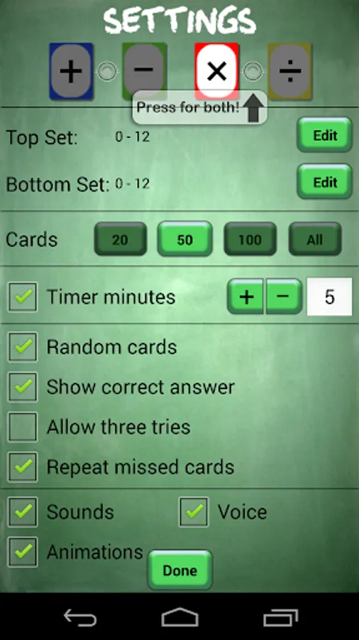 • number ranges: 0 to 50 for addition and subtraction
