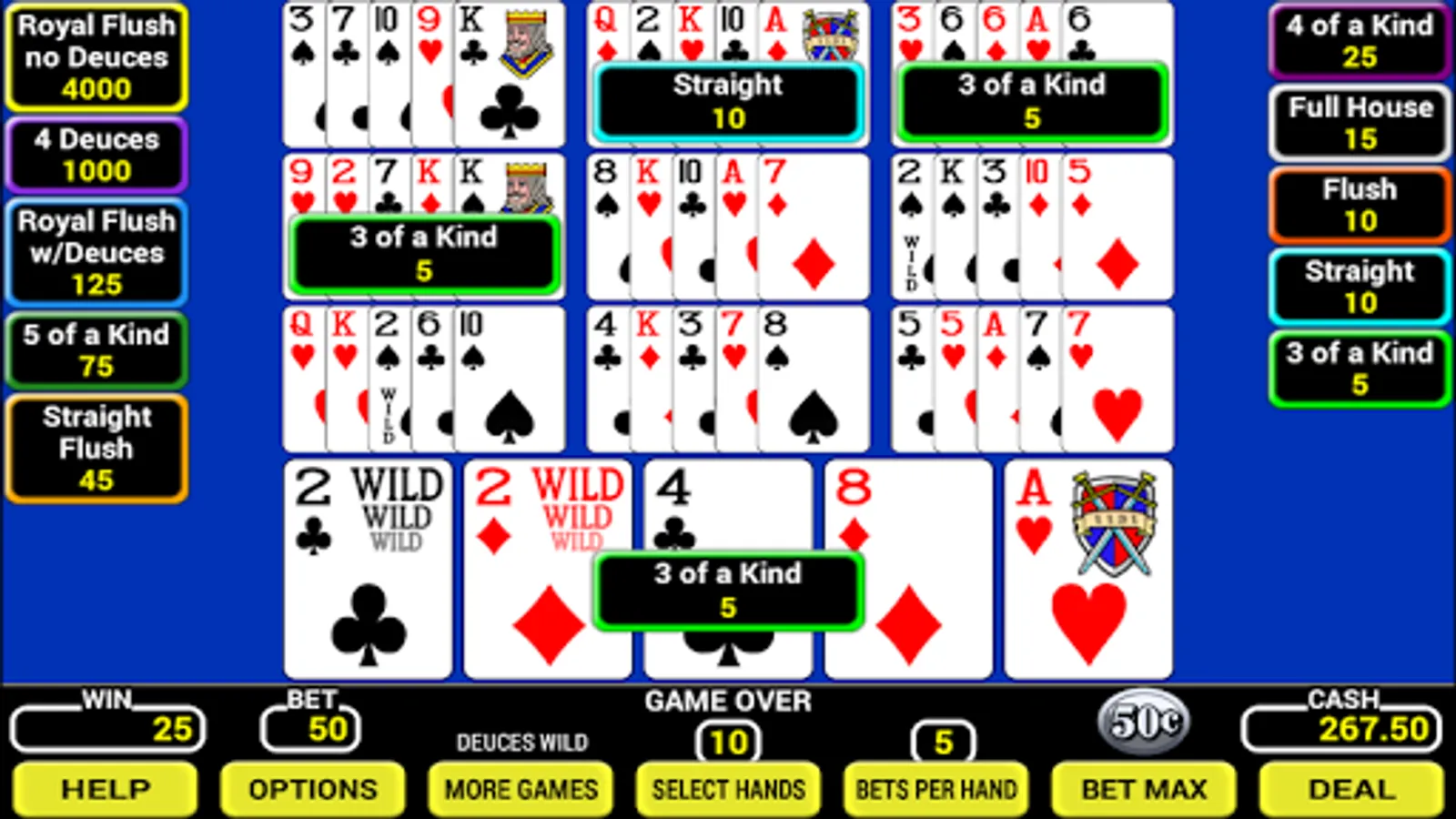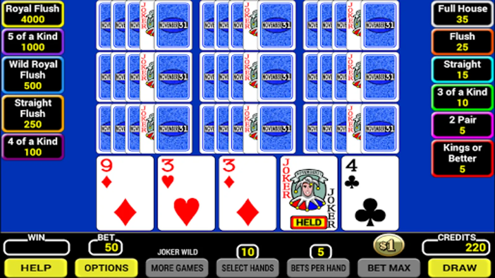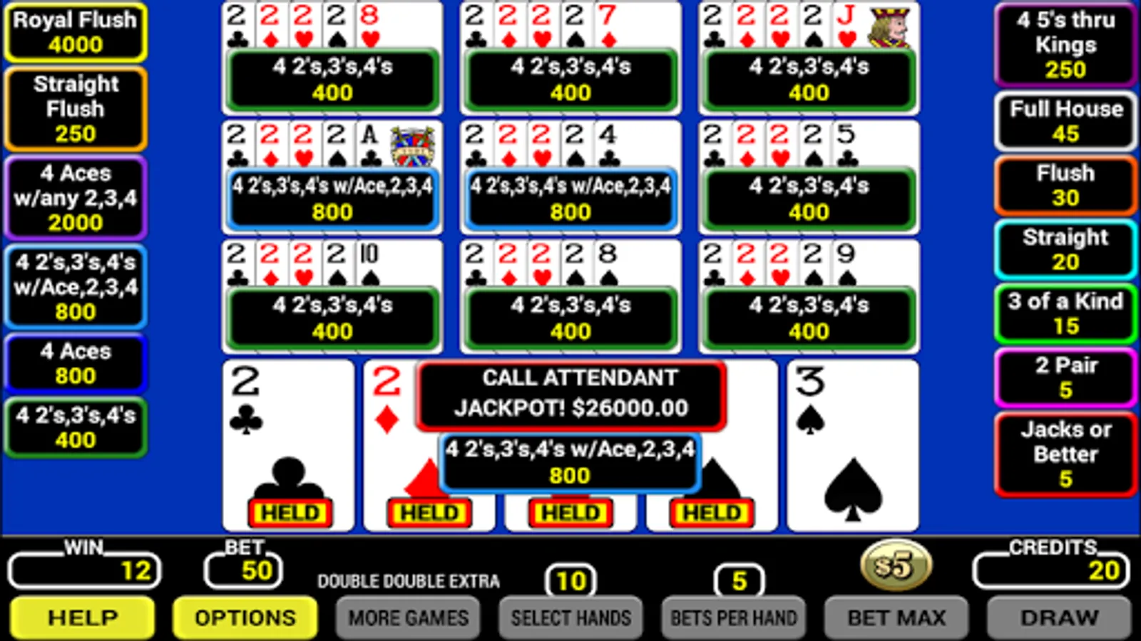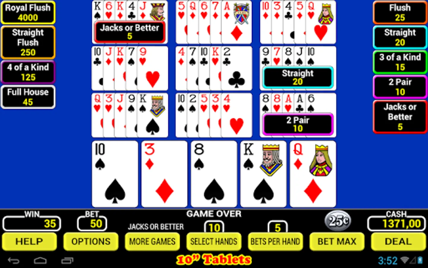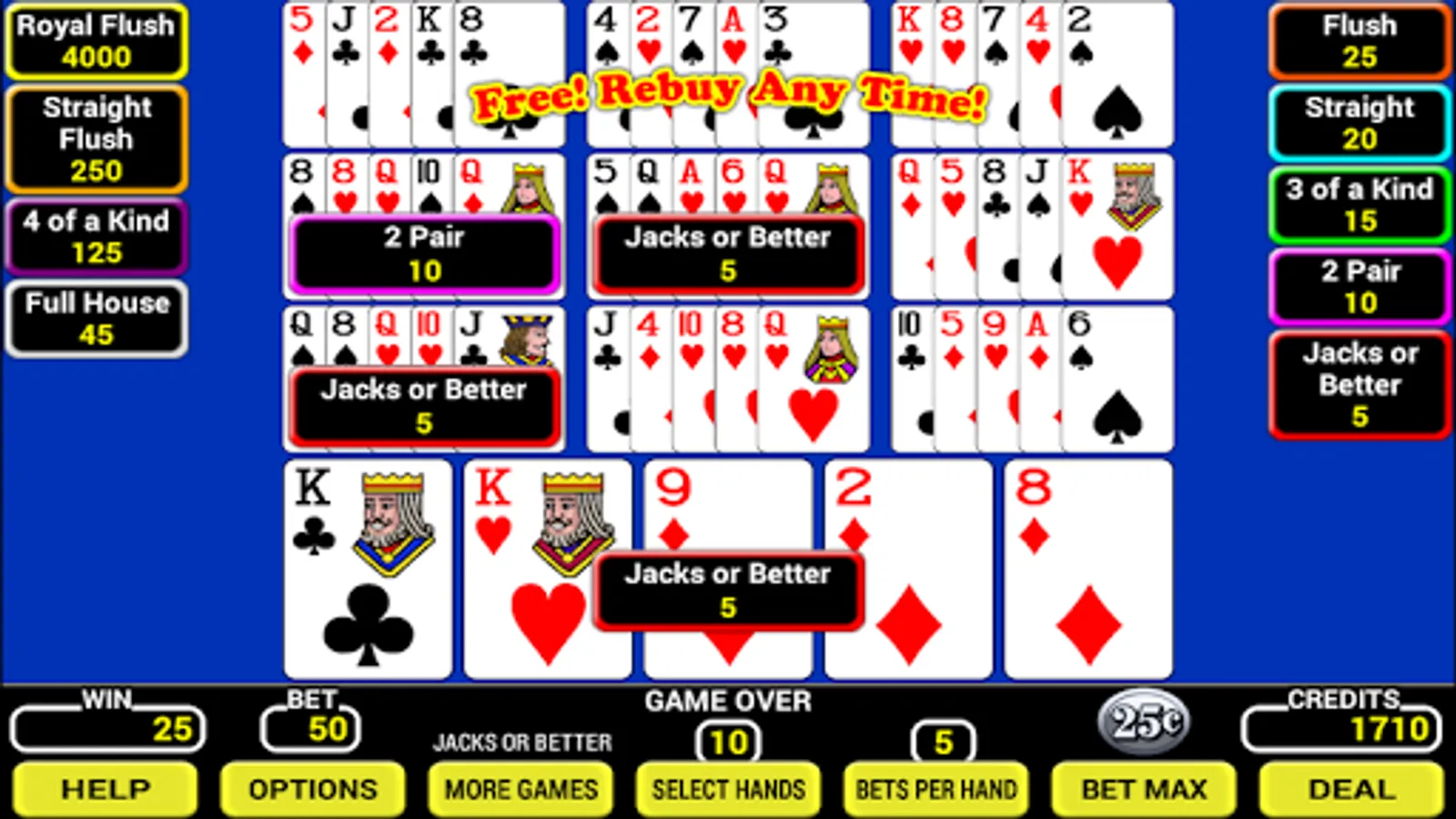Ten hand multi-play video poker. Ten hands at once for ten times the action! Unlike slots machines, video poker allows the player to use skill to beat the house. Play this popular game just like in Vegas.