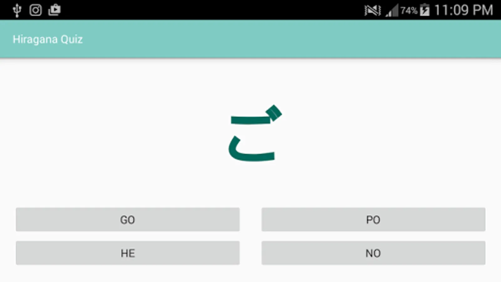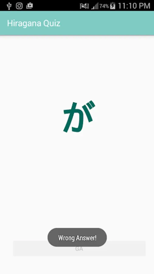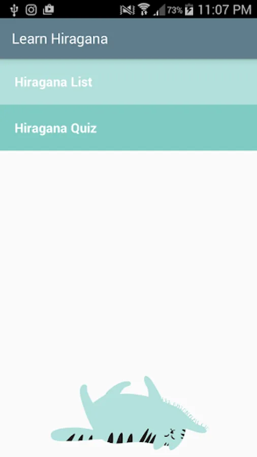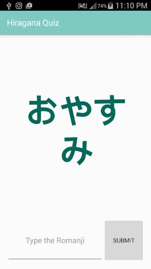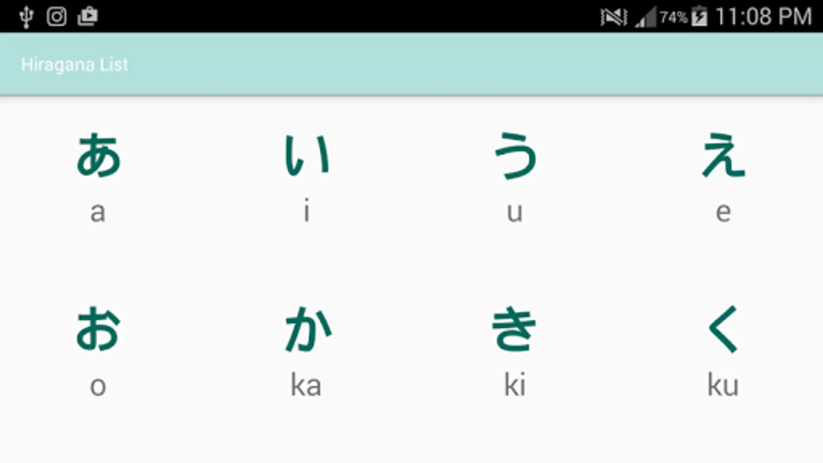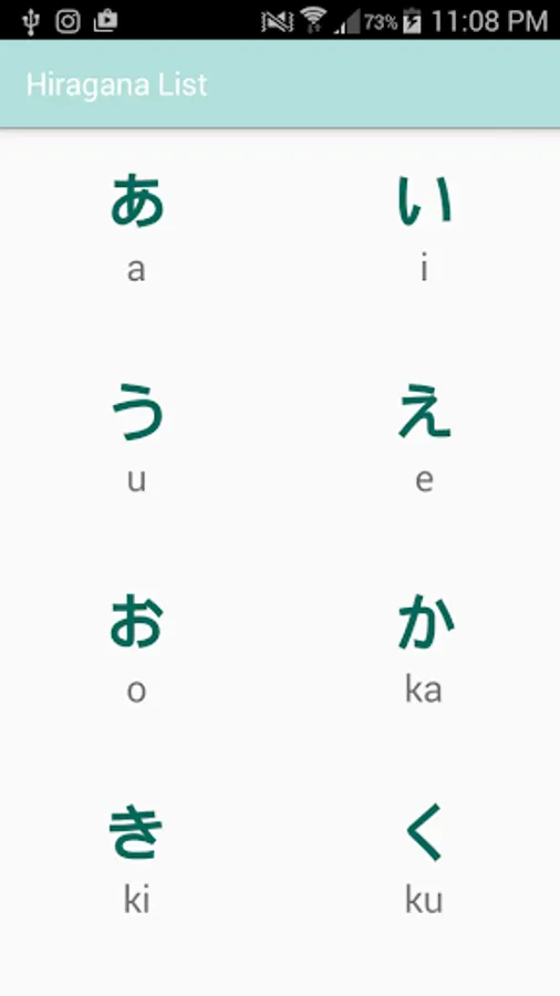 This is a simple Japanese learning app containing a list of Hiragana characters and their corresponding Romanji pronunciation. The app also contains a short multiple choice quiz and reading quiz to test your learning.