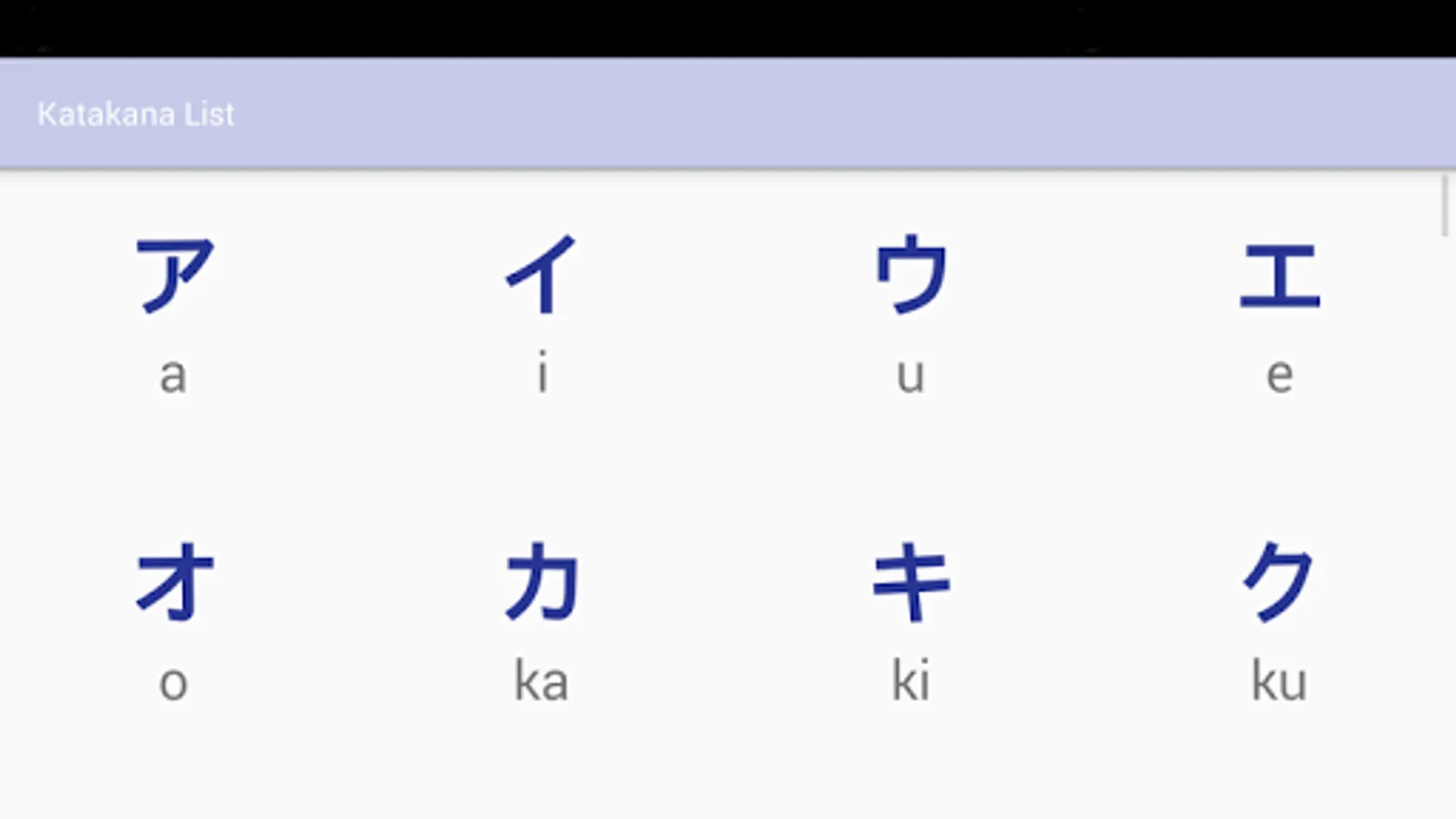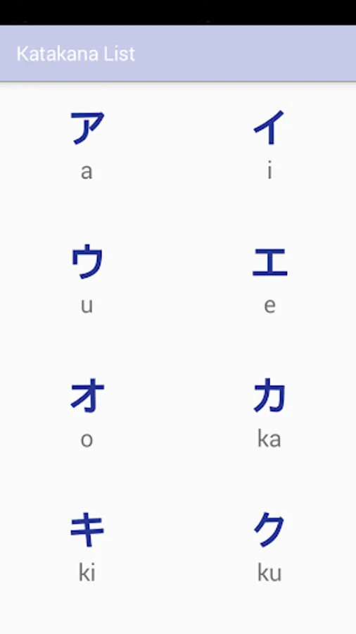 This is a simple Japanese learning app containing a list of Katakana characters and their corresponding Romanji pronunciation. The app also contains a short multiple choice quiz and reading quiz to test your learning.