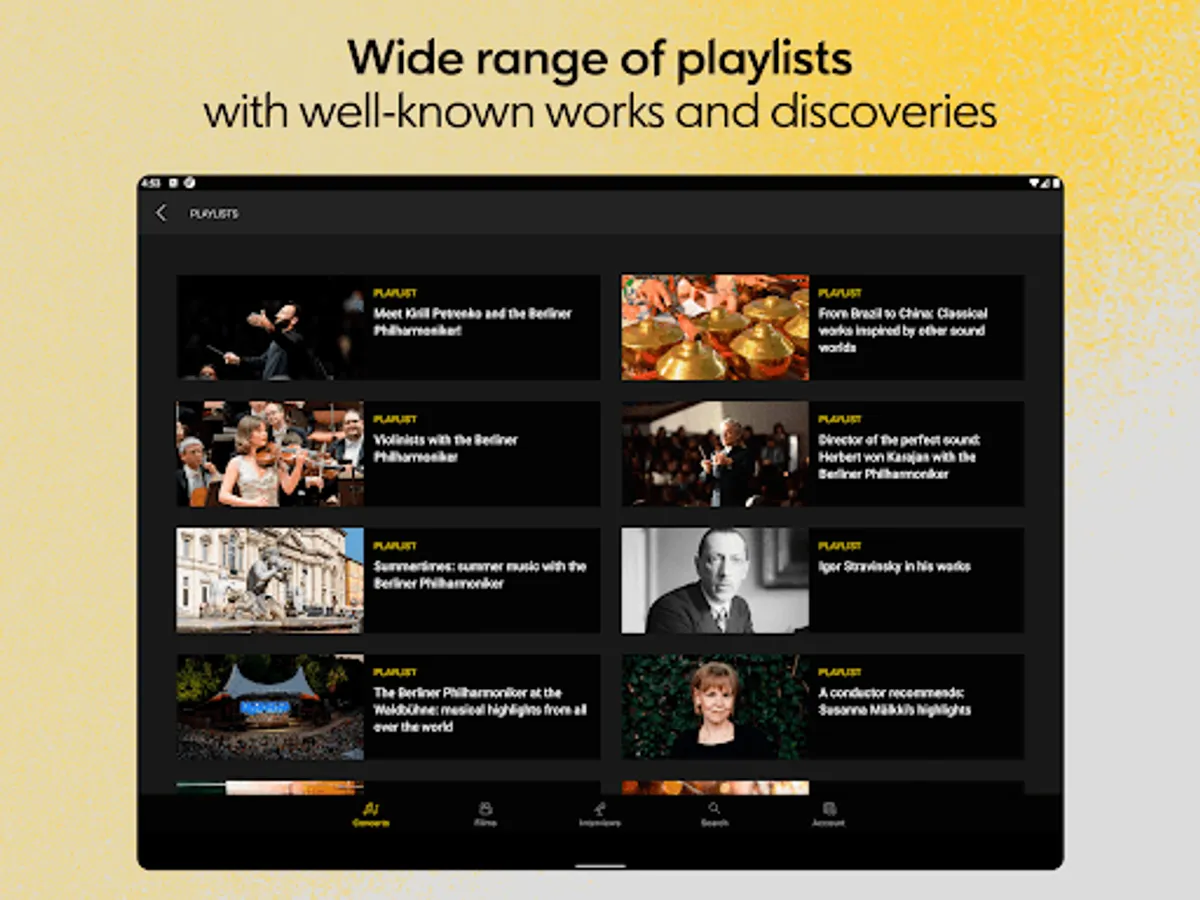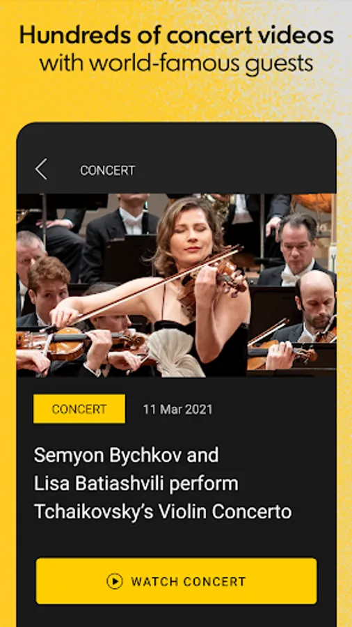 Digital Concert Hall is the most extensive media player and video archive for classical music. Watch live performances of all big symphonies by the great composers like Beethoven, Mozart or Schubert on your mobile device or easily stream on TV via Chromecast. Register without obligation and get 7 days access to amazing classical music concerts completely free of charge.