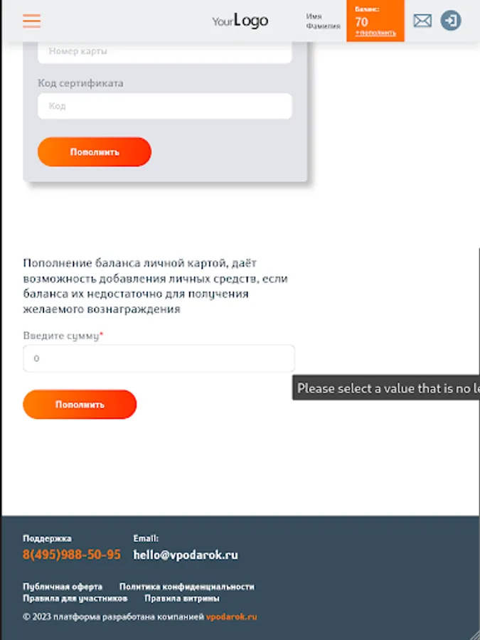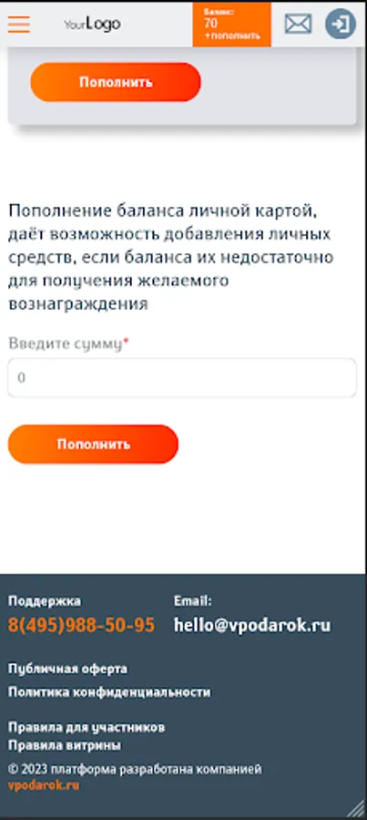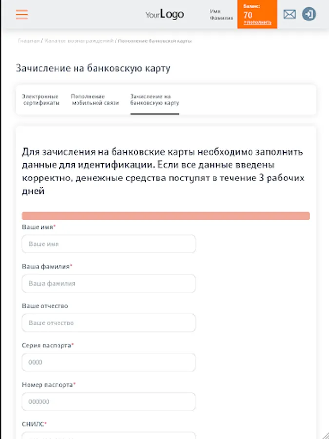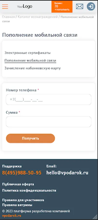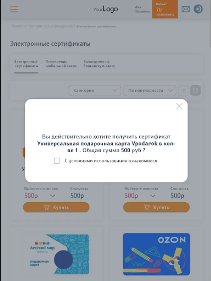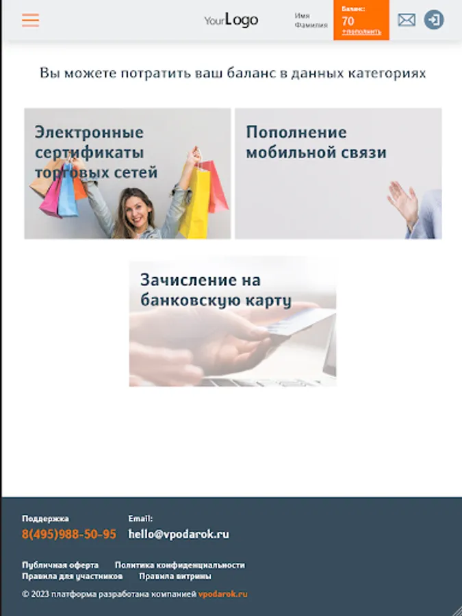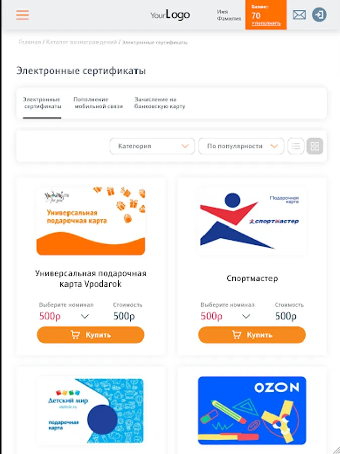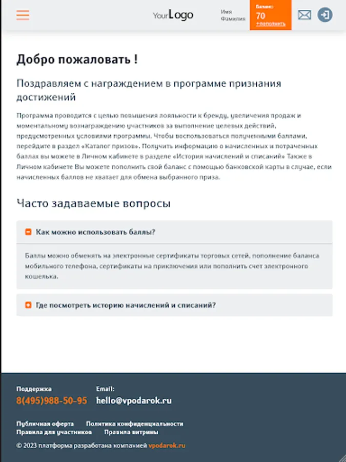 A wide range of different rewards: electronic certificates, virtual Visa card, transfers to mobile phone and electronic wallets, with instant delivery to the participant. Extended statistics, automatic generation of reports and a built-in module for accounting for personal income tax. All participants have access to a mobile application where they can receive and exchange points for rewards