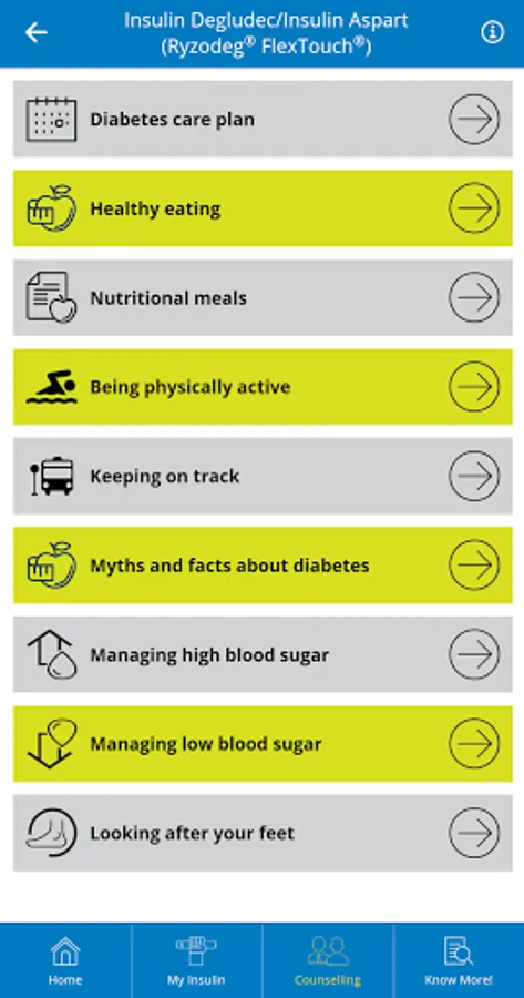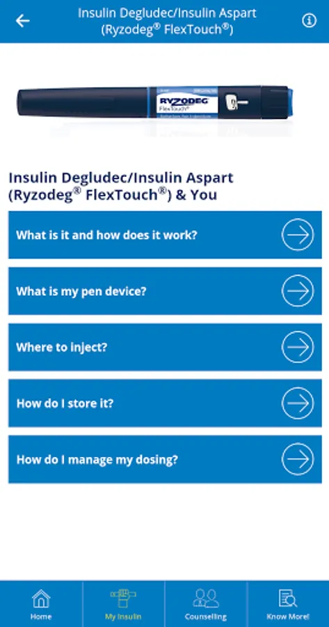 The My Insulin Buddy application provides an easy, simple and convenient access to information for the prescribed users of Insulin Degludec/Insulin Aspart (Ryzodeg® FlexTouch®). This application should be only used by patients who have been prescribed with Insulin Degludec/Insulin Aspart (Ryzodeg® FlexTouch®) by their doctor. This provides information on the proper use of the insulin as well as on the general diabetes management. This material serves only as a guide and should not intend to replace medical advice of the doctor.
