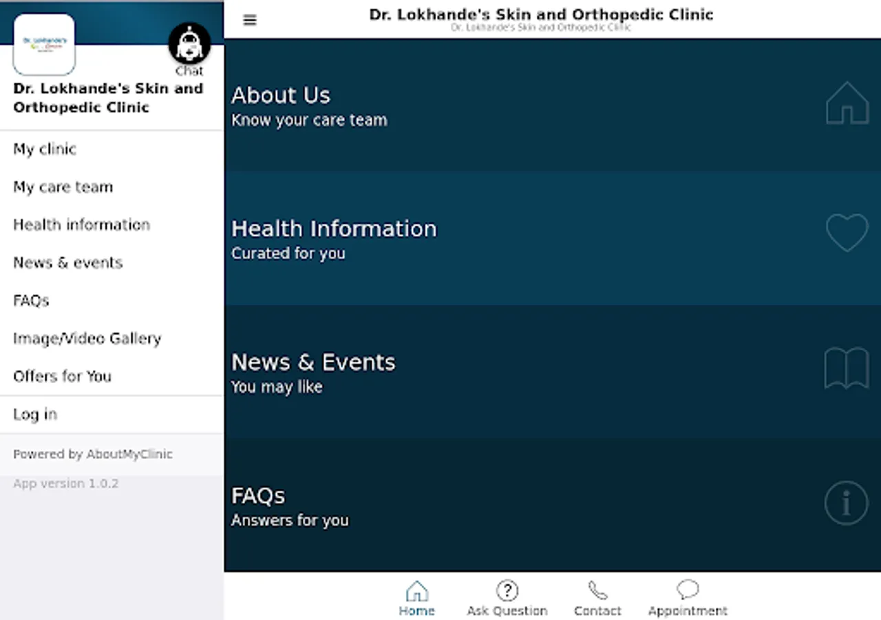 This official app of Dr. Lokhande's Skin & Orthopedic Clinic connects you with renowned Orthopedist in Pune, Dr. Vijayanand Lokhande and his entire care team. The app gives practical & helpful tools to manage your health & communications with Dr. Lokhande's Skin & Orthopedic Clinic on the go. The app provides engaging & evidence-based health information on diseases, conditions, treatments & procedures, in a language that you can easily understand. You can also find answers to frequently asked questions (FAQs). Should you not find an answer to your specific question, simply ask the same to your favorite care team at Dr. Lokhande's Skin & Orthopedic Clinic and converse with them securely. You can also request an appointment, stay tuned with news, or register for exciting events at the clinic which may help you manage your health better.