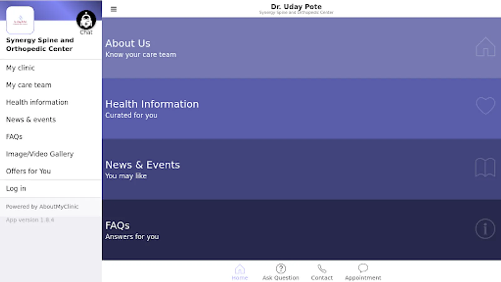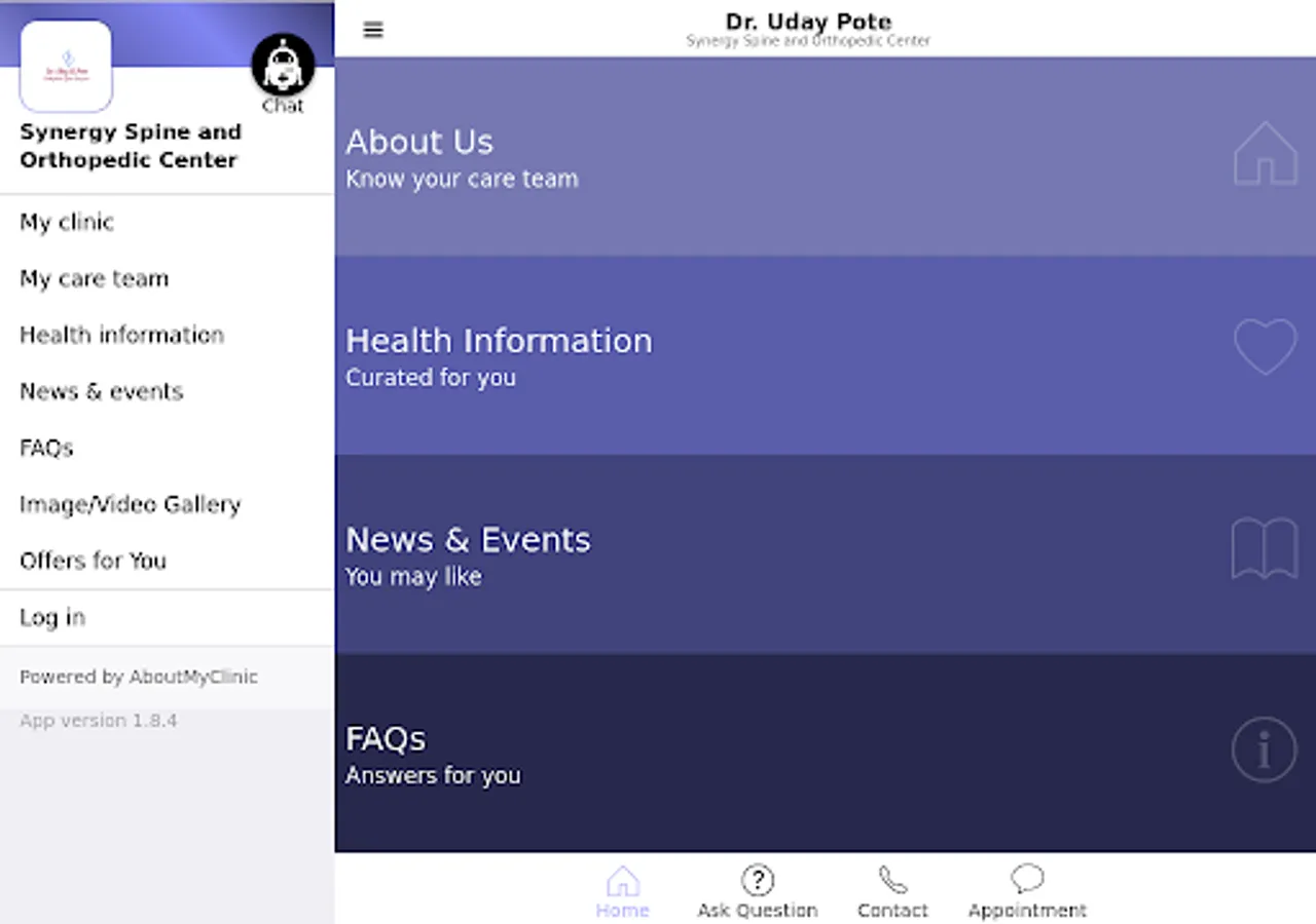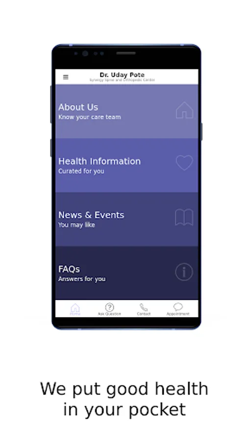 This official app of Synergy Spine & Orthopedic Center connects you with renowned Consultant Orthopedic Spine Surgeon in Pune, Dr. Uday B. Pote and his entire care team. The app gives practical & helpful tools to manage your health & communications with Synergy Spine & Orthopedic Center on the go. The app provides engaging & evidence-based health information on diseases, conditions, treatments & procedures, in a language that you can easily understand. You can also find answers to frequently asked questions (FAQs). Should you not find an answer to your specific question, simply ask the same to your favorite care team at Synergy Spine & Orthopedic Center and converse with them securely. You can also request an appointment, stay tuned with news, or register for exciting events at the clinic which may help you manage your health better.