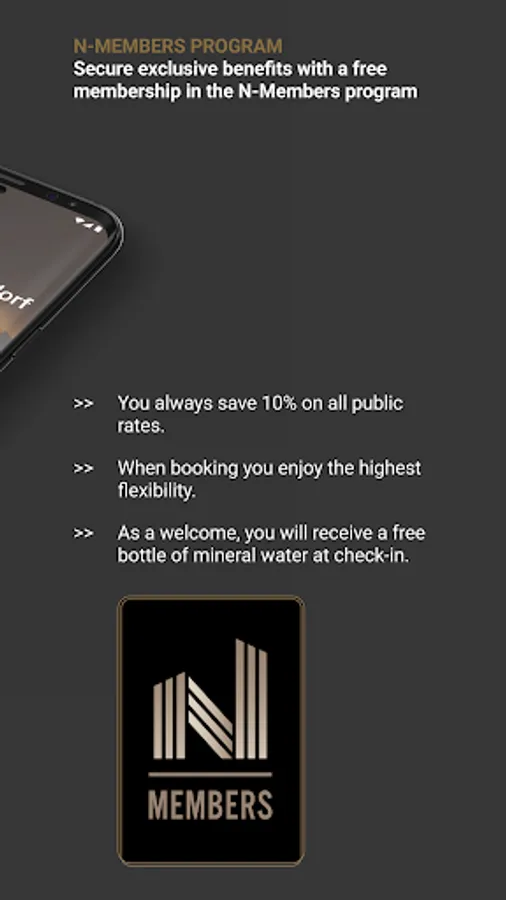 Sign up to our N-Members program and receive exclusive benefits: right after signing up in the app, which takes less than a minute, you'll enjoy a range of exclusive benefits as an N-Member. For all our guests - no matter if you are a regular guest or a first-time booker.