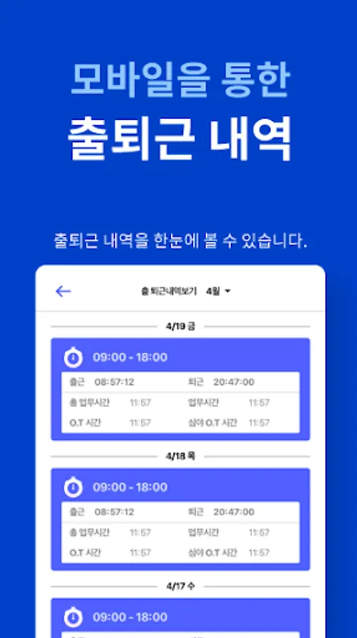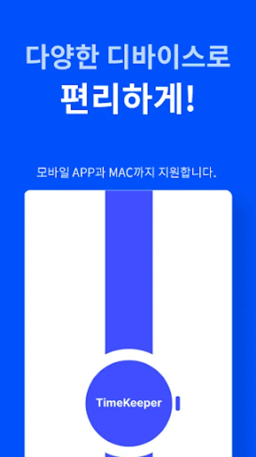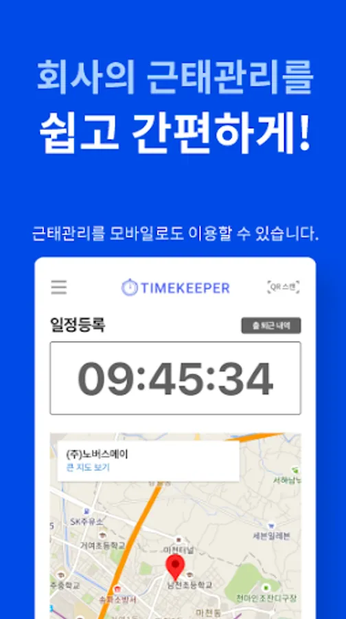 Timekeeper is an app certified by the Korea Communications Commission, and you can manage commute and out-of-office information with a mobile app.