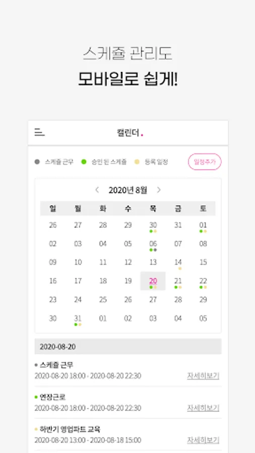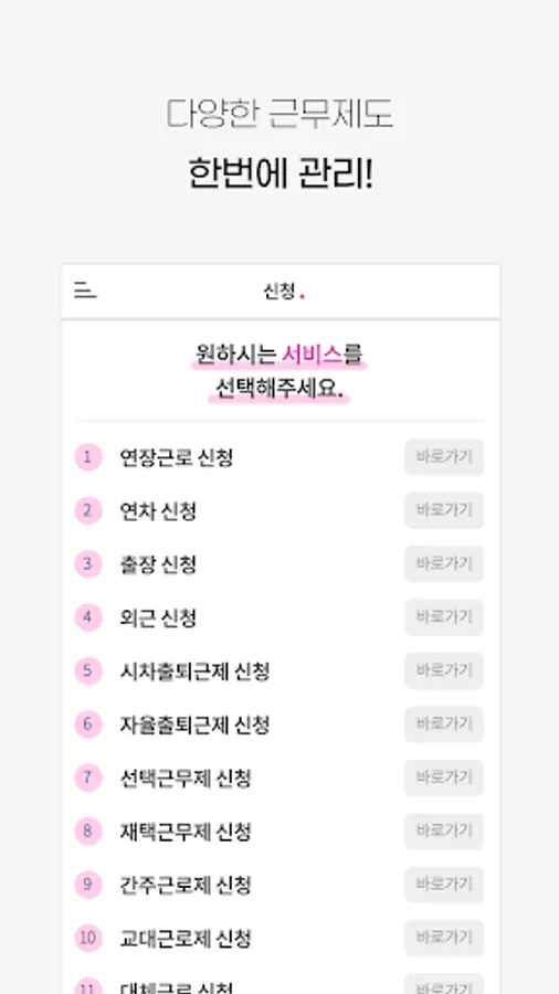 You can easily apply for work-related matters (extended work, vacation, business trip, outside work) and view work details anytime, anywhere on mobile.