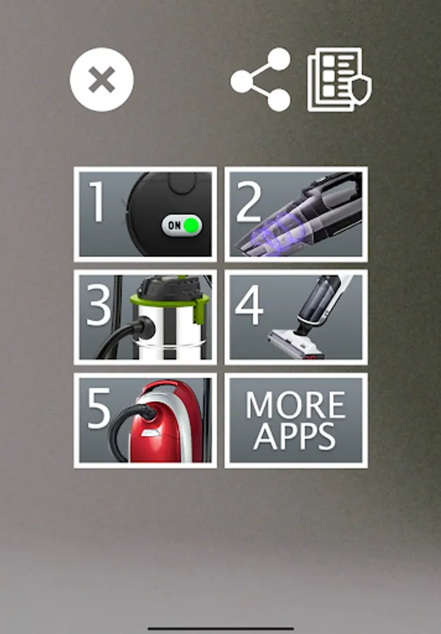 This app contains the sounds of 5 types of vacuum cleaners such as: robot vacuum cleaner, handheld vacuum cleaner, conventional and construction.