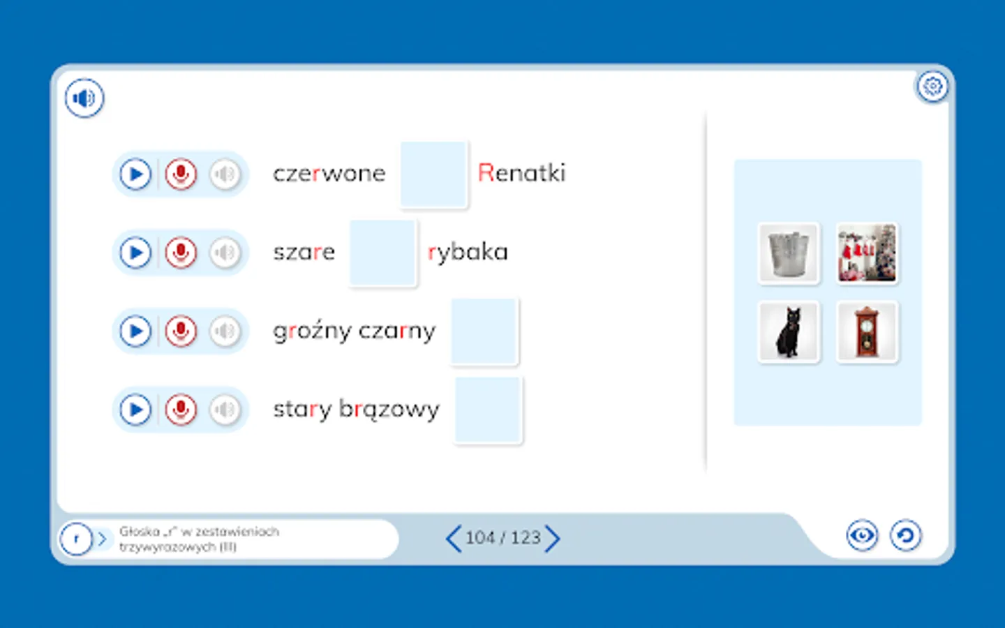• the only multimedia program with exercises for ALL stages of sound therapy (sound in: isolation, onomatopoeia, syllables, logotoms, words, word combinations, prepositional phrases, sentences, text and in spontaneous speech),