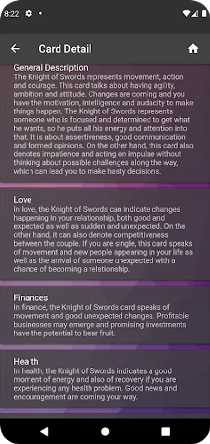 📚 Detailed card interpretations: Discover the symbolism and meaning of each card in love, health, career, family, friendship, finances, and more.