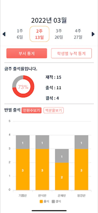 반별, 부서별 출결 통계