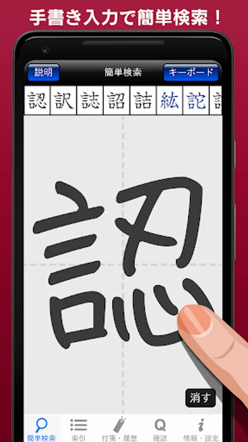 Simply write the kanji you want to know on the screen with your finger, and the characters will be recognized and displayed immediately.