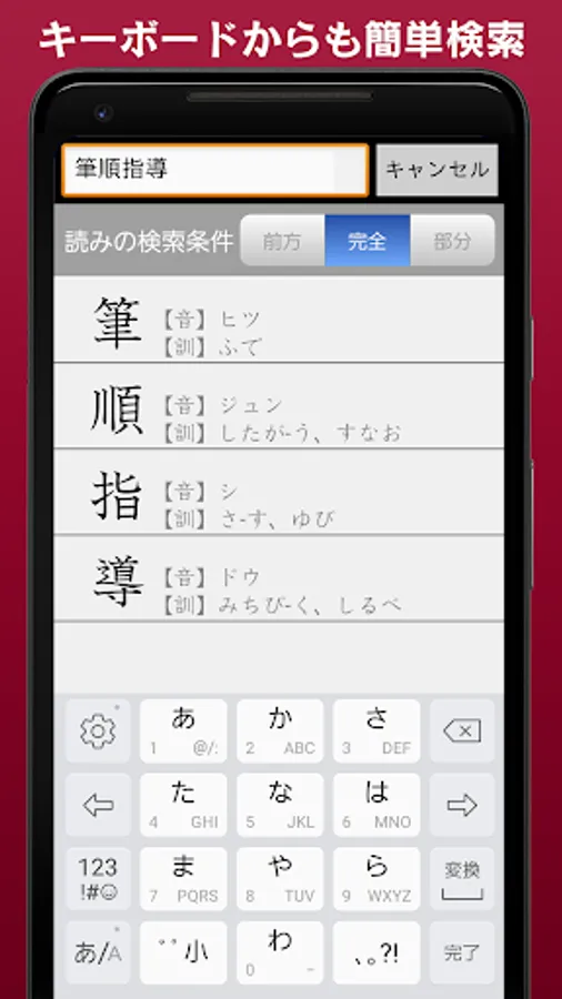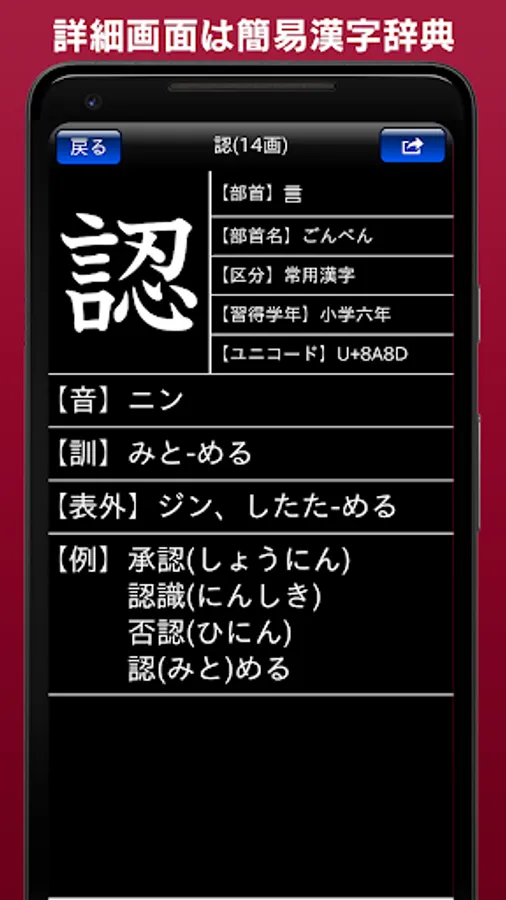 Kanji is displayed large on the entire screen. You can check the tomes and splashes that were difficult to see until now, and the Chinese characters with many strokes.