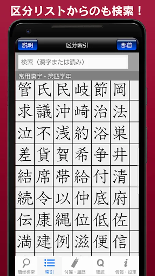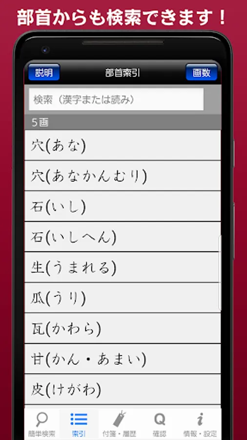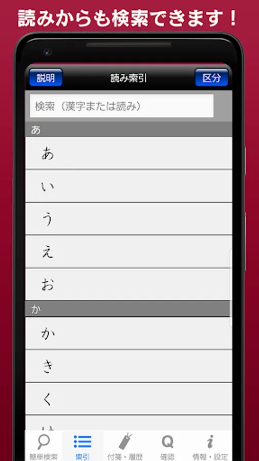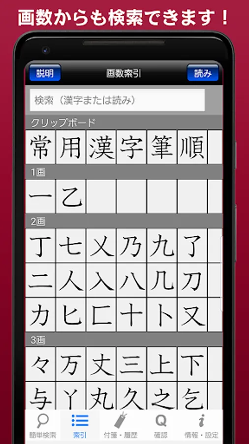 Searching for kanji is very easy. If you write the kanji directly on the screen with your finger, the kanji will be displayed large and beautiful. You can also search by the number of strokes and reading.