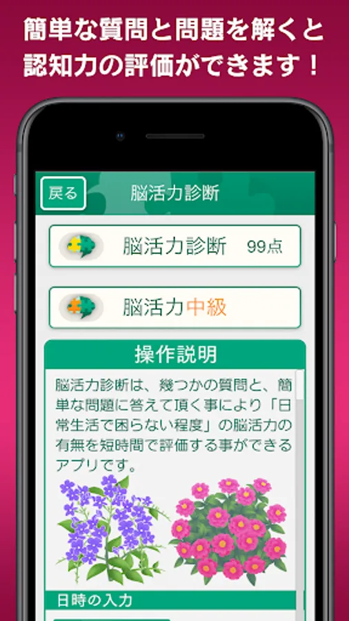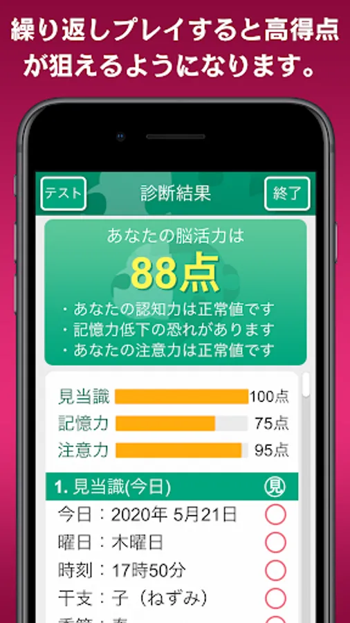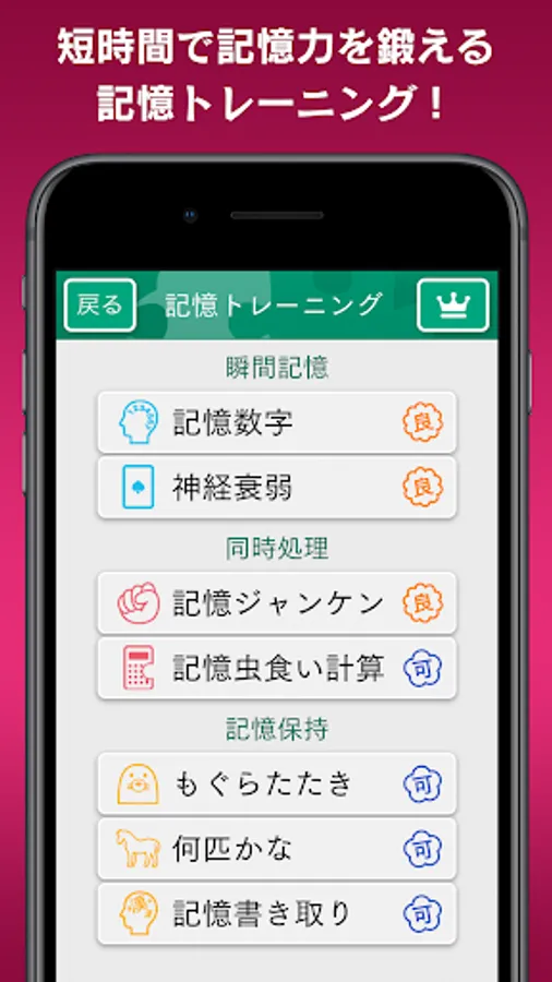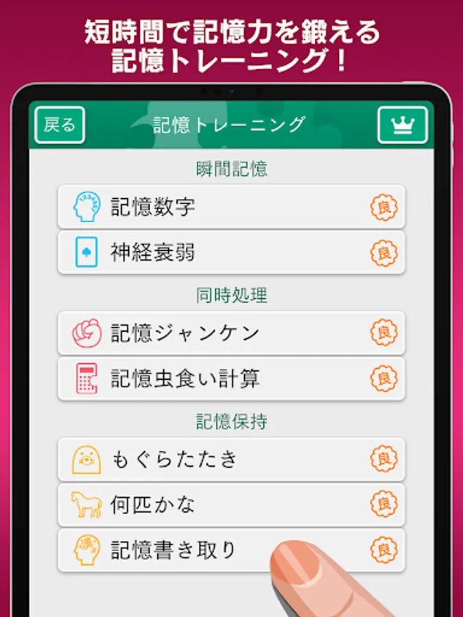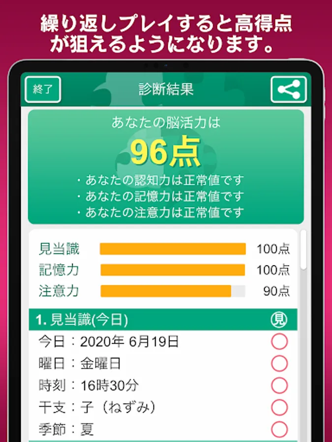 In addition to examining brain vitality, this app allows you to train your "memory". "Today's training" for those who want to proceed little by little every day can be played in a short time, so please continue every day.