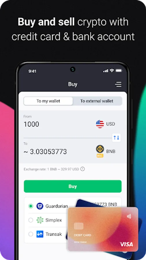Use our in-app exchange or your bank account and Visa/MasterCard.