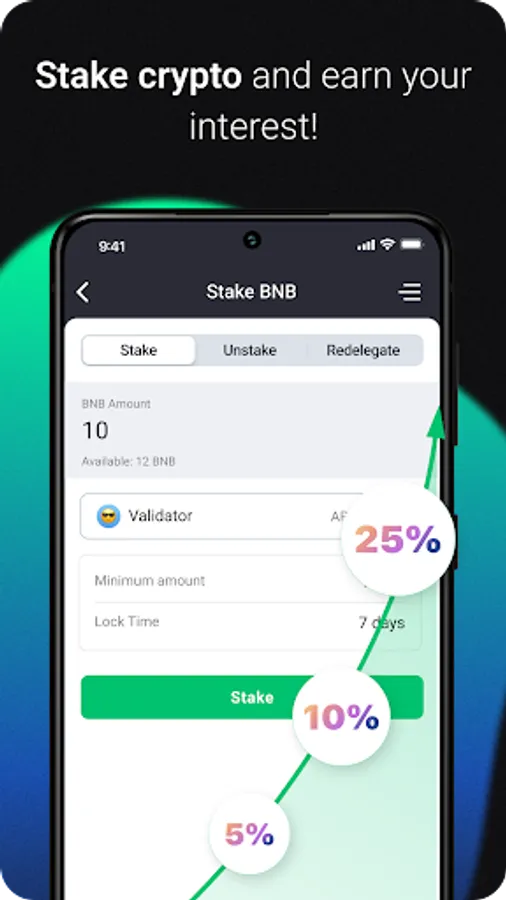 Stake and yield high returns on supported assets such as Cardano (ADA), Tron (TRX), Solana (SOL), Tezos (XTZ), Cosmos (ATOM), NOW (BEP2), and others!