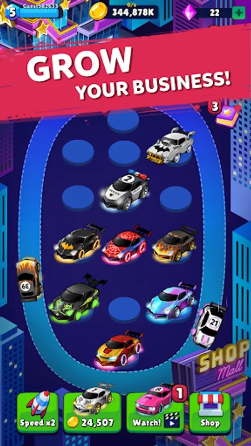 Buy, merge cars and manage race track to earn money. Unlock new garage slots and expand. Do not forget to collect cars and build car empire. Enjoy events with: trucks, tanks or merge plane.