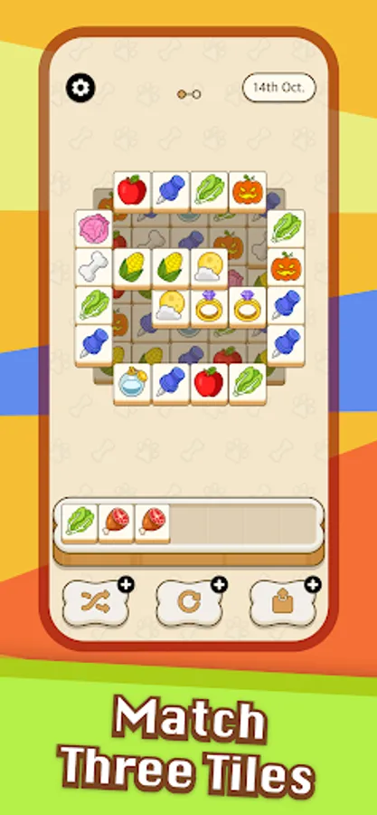 🔲 Click and move the tile into the dog bowl, three tiles with the same pattern will be matched and merged automatically.
