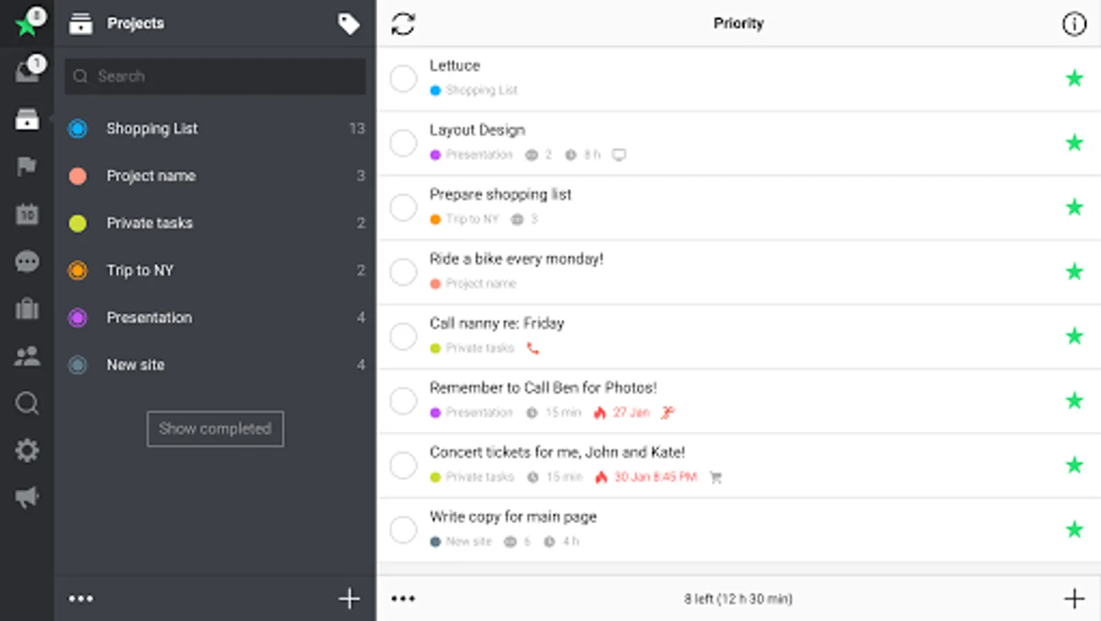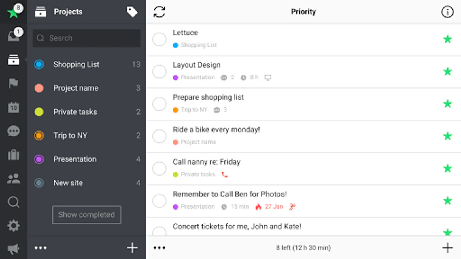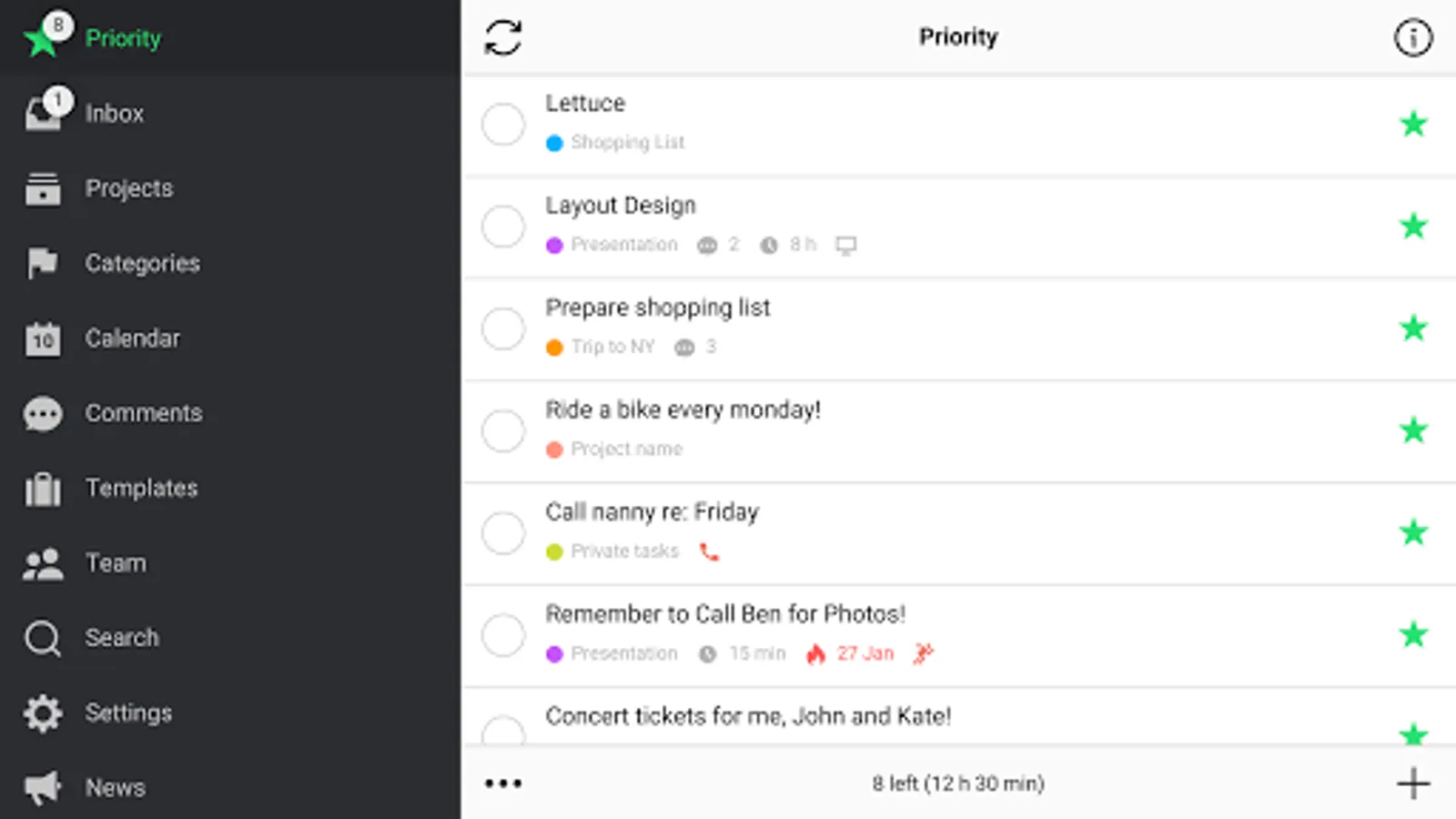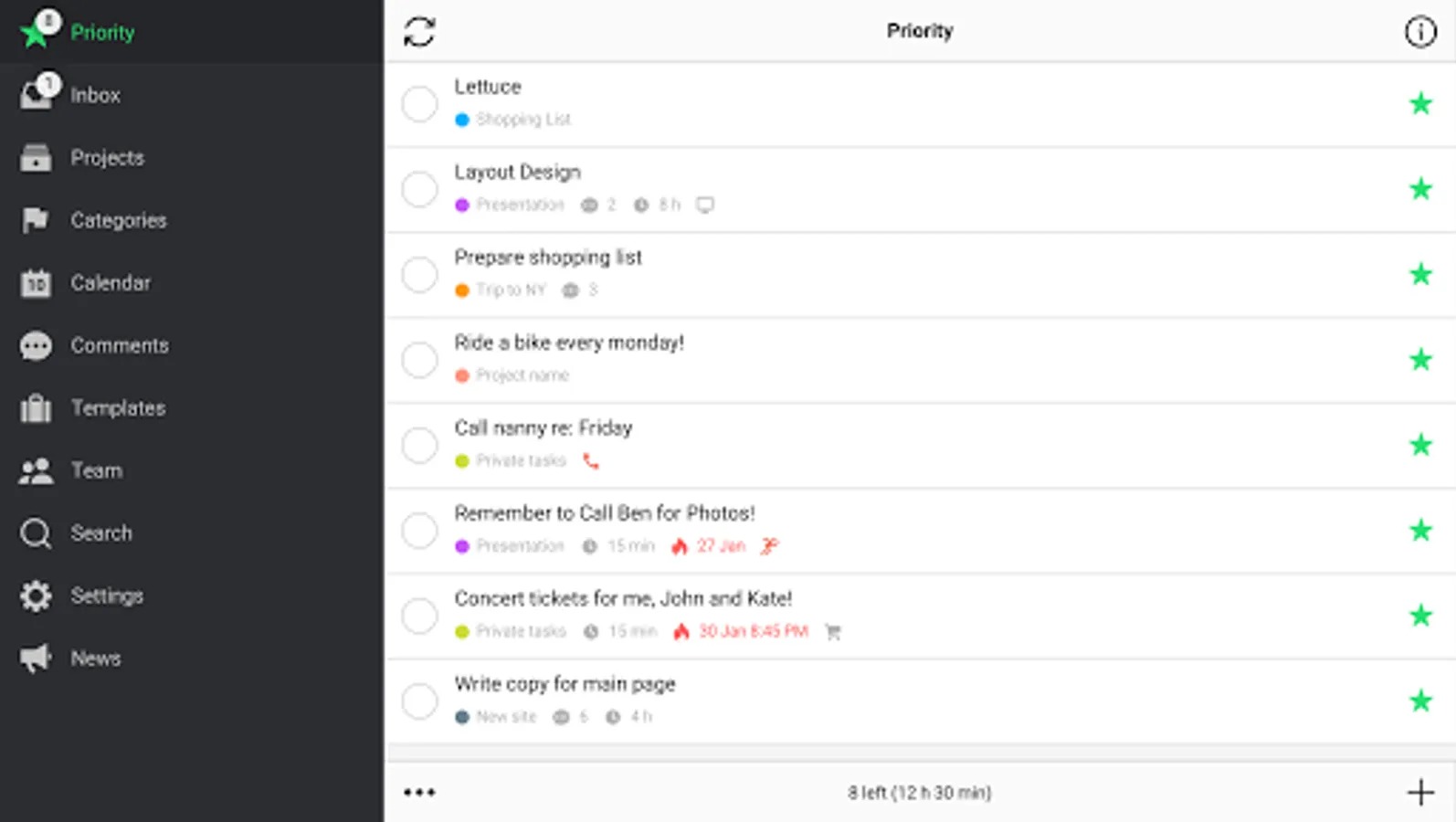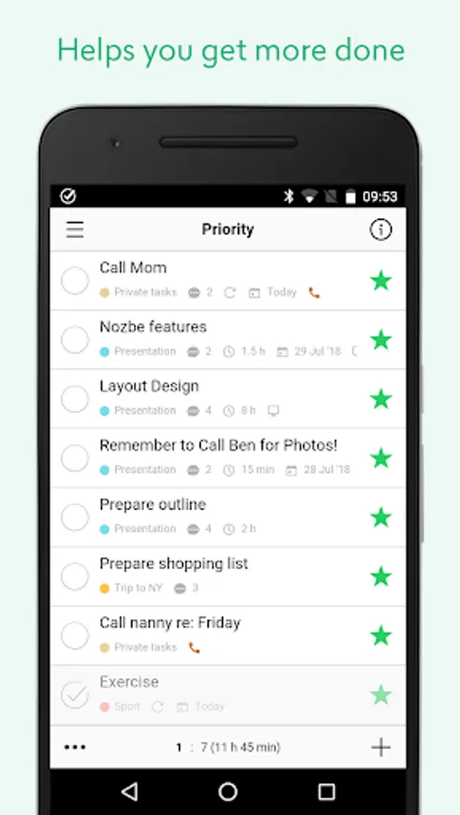 Don't keep things on your mind, put them in your trusted Nozbe system. Add tasks from anywhere, organize them in projects, mark priority tasks with a star and schedule things to do later. Use categories/contexts to batch tasks and get everything done faster.