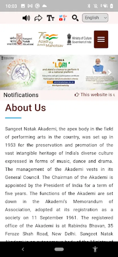 Sangeet Natak Akademi, the apex body in the field of performing arts in the country, was set up in 1953 for the preservation and promotion of the vast intangible heritage of India’s diverse culture expressed in forms of music, dance and drama. The management of the Akademi vests in its General Council. The Chairman of the Akademi is appointed by the President of India for a term of five years. The functions of the Akademi are set down in the Akademi’s Memorandum of Association, adopted at its registration as a society on 11 September 1961. The registered office of the Akademi is at Rabindra Bhavan, 35 Feroze Shah Road, New Delhi. Sangeet Natak Akademi is an autonomous body of the Ministry of Culture, Government of India.