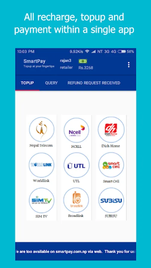 Download and use our app for online mobile top-ups and bill payments for following servies: