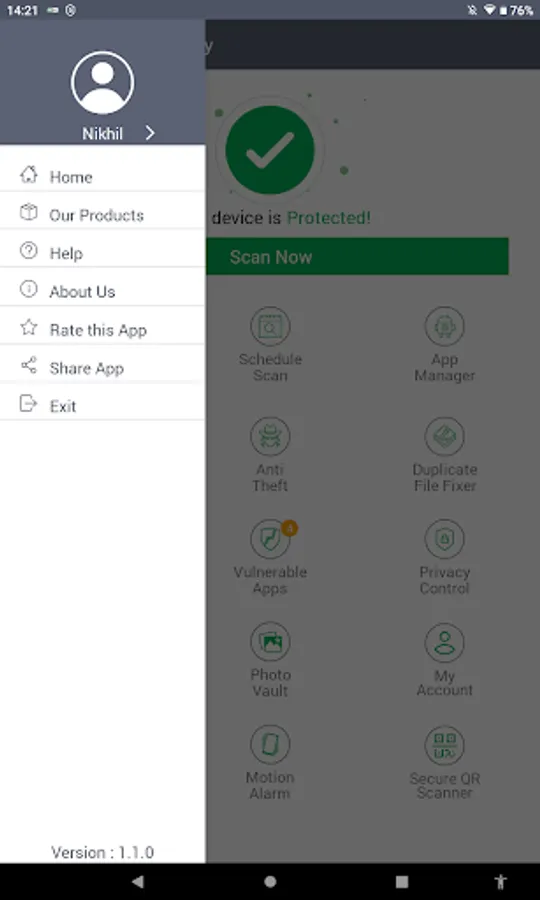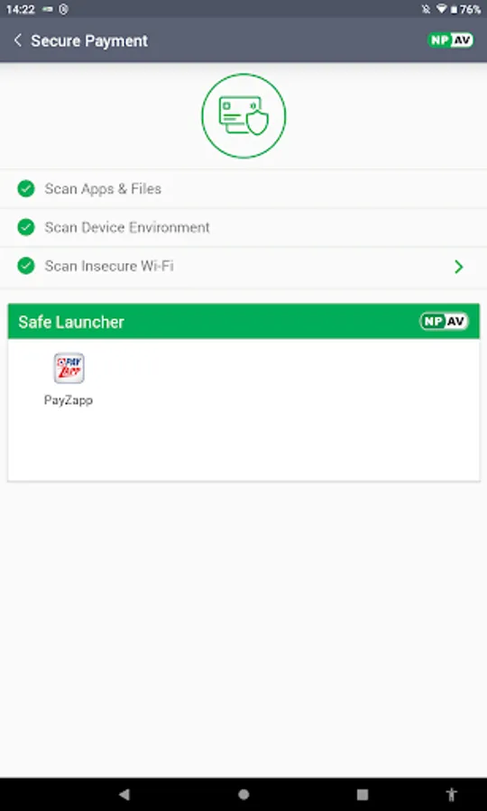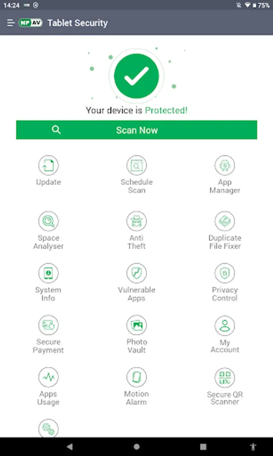 Mobile devices such as mobile phones, tablets, laptops, etc are convenient as well as vulnerable to attacks by many malicious agents through networks or any other medium. If users do not aware of these files or attacks, they can either lose privacy, data, or money. "Npav Tablet Security app" provides features to reduce the risk of it or to protect users from these malicious agents. It will provide protection from various viruses, malware, and spyware that can threaten your privacy and cause Ineffable damage.