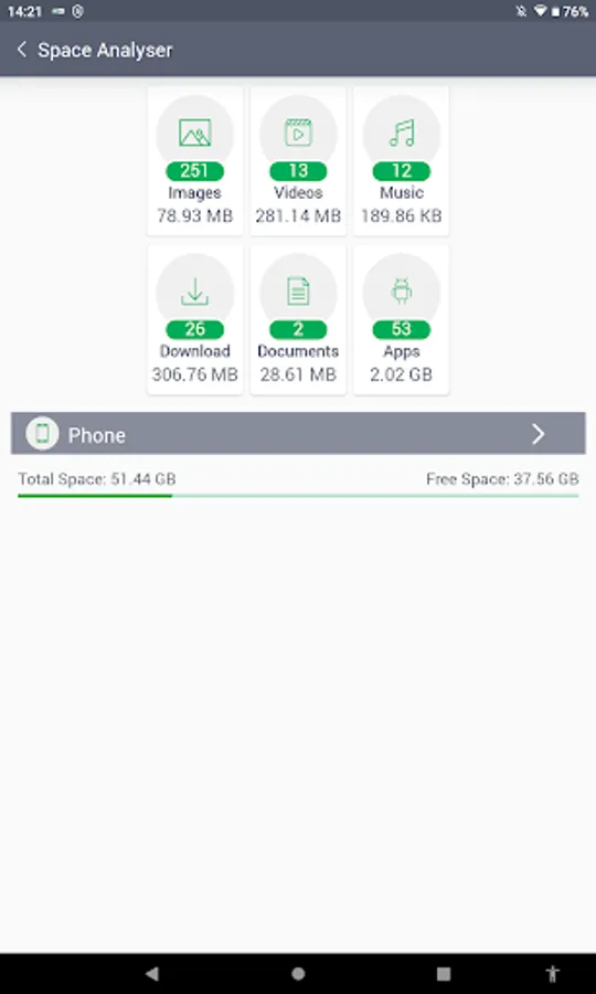 It gives information about available or used spaces in internal and external memory for memory management. It categorizes the whole space available according to file type e.g. Images, Videos, Documents, Apps, or Downloads and sorting is available for all the files. Users can get the explicit path of a file/directory.
