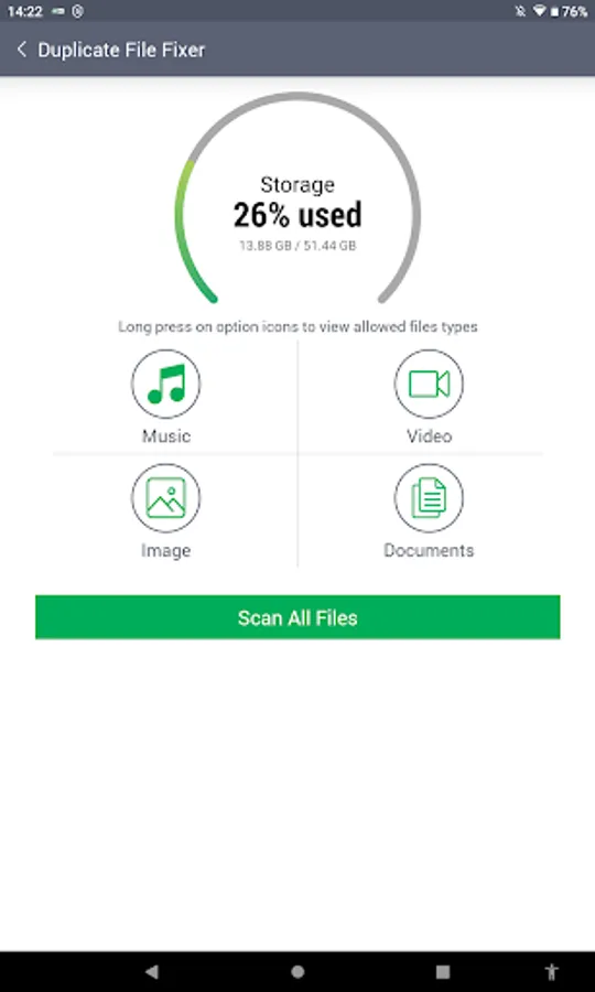 It finds all the file that appears more than once on the device and provides the option to clear multiple appearances of type of file. It is also categorized on the basis of file types. Users are often able to find such files, but it captures memory unnecessarily.