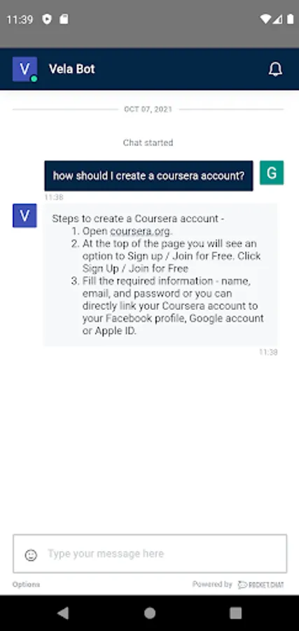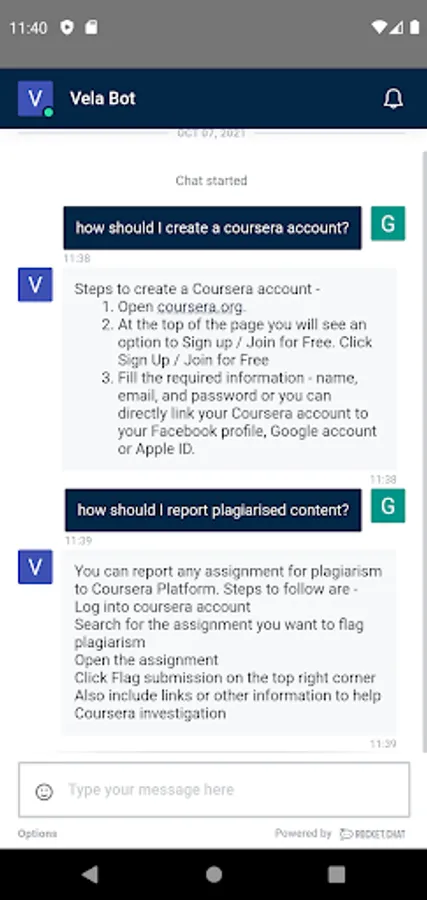 Leveraging the power of AI, VELA will simulate a human chat conversation. She identifies learners’ questions and resolves them by making relevant platform-related information available in real-time. VELA will be available to learners 24/7 through a live chat interface for ease of communication. Learners can also take assistance from human experts and get their questions resolved within 24 hrs.