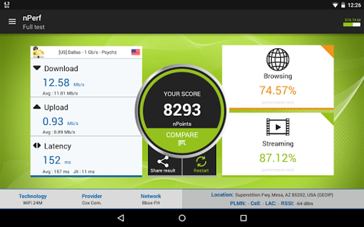 Full QoS test: In few seconds, test your bitrate speed, latency, browsing speed and video streaming quality on your mobile device.
